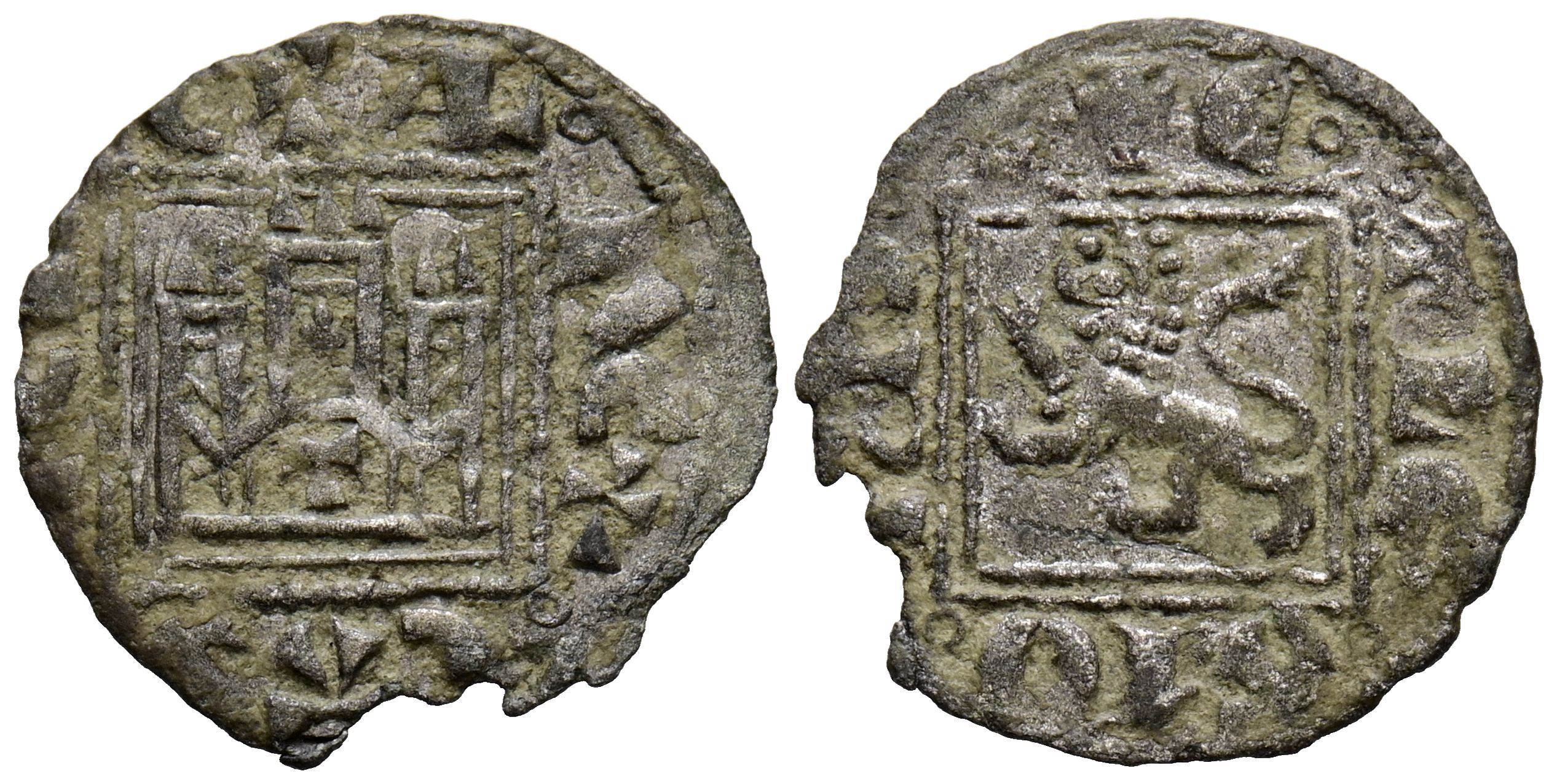 ALFONSO XI (1312-1350). Dinero Novén. (Ve. 0,71g/18mm). Toledo. (Imperatrix A11:1.35(50); FAB-359.1). Anv: Castillo con T en puerta, todo dentro de gráfila cuadrada, alrededor leyenda: AL REX CAS OLL E. Rev: León rampante a izquierda, alrededor leyenda: ET LE GIO NIS R. MBC.