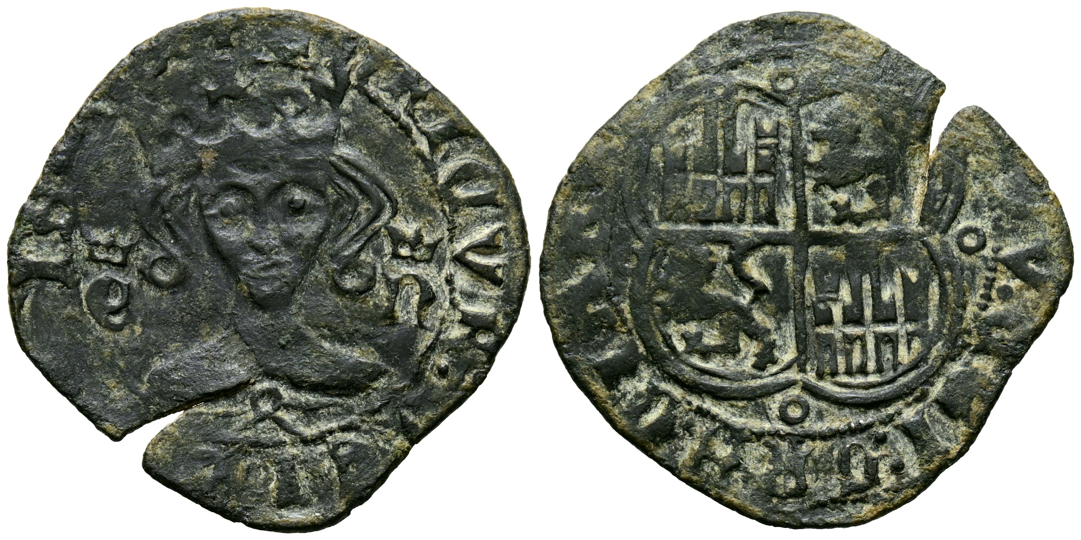 ENRIQUE II (1368-1379). Real de Vellón. (Ve. 2,44g/25mm). Sin ceca. (Imperatrix E2:15,68; FAB-432). Anv: Busto coronado de frente entre E y N coronadas, todo dentro de gráfila circular, alrededor leyenda: ENRICVS DEI GRACIA REX CASTELLE. Rev: Cuartelado de castillos y leones rampantes a izquierda, dentro de gráfila cuatrilobular con cuatro roeles, alrededor leyenda: ENRICVS DEI GRACIA REX CASTELLE. MBC