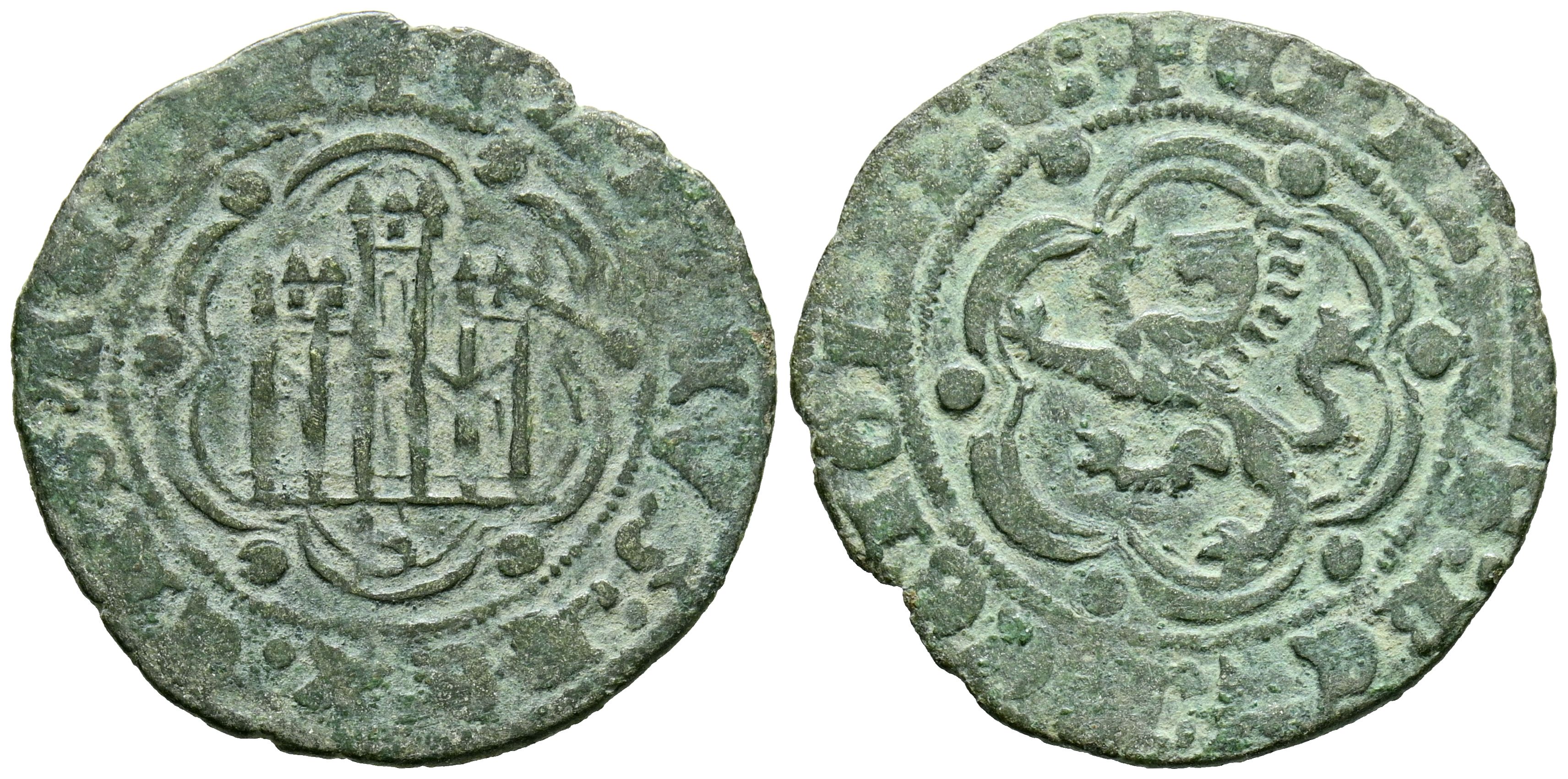 ENRIQUE III (1390-1406). Blanca. (Ae. 1,83g/24mm). Sevilla. (Imperatrix E3:1.11; FAB-602). Anv: Castillo, debajo S, todo dentro de gráfila lobular, alrededor leyenda: ENRICVS REX CASTELL. Rev: León rampante a izquierda, dentro de gráfila lobular, alrededor leyenda: ENRICVS REX LEGIONIS E. MBC.