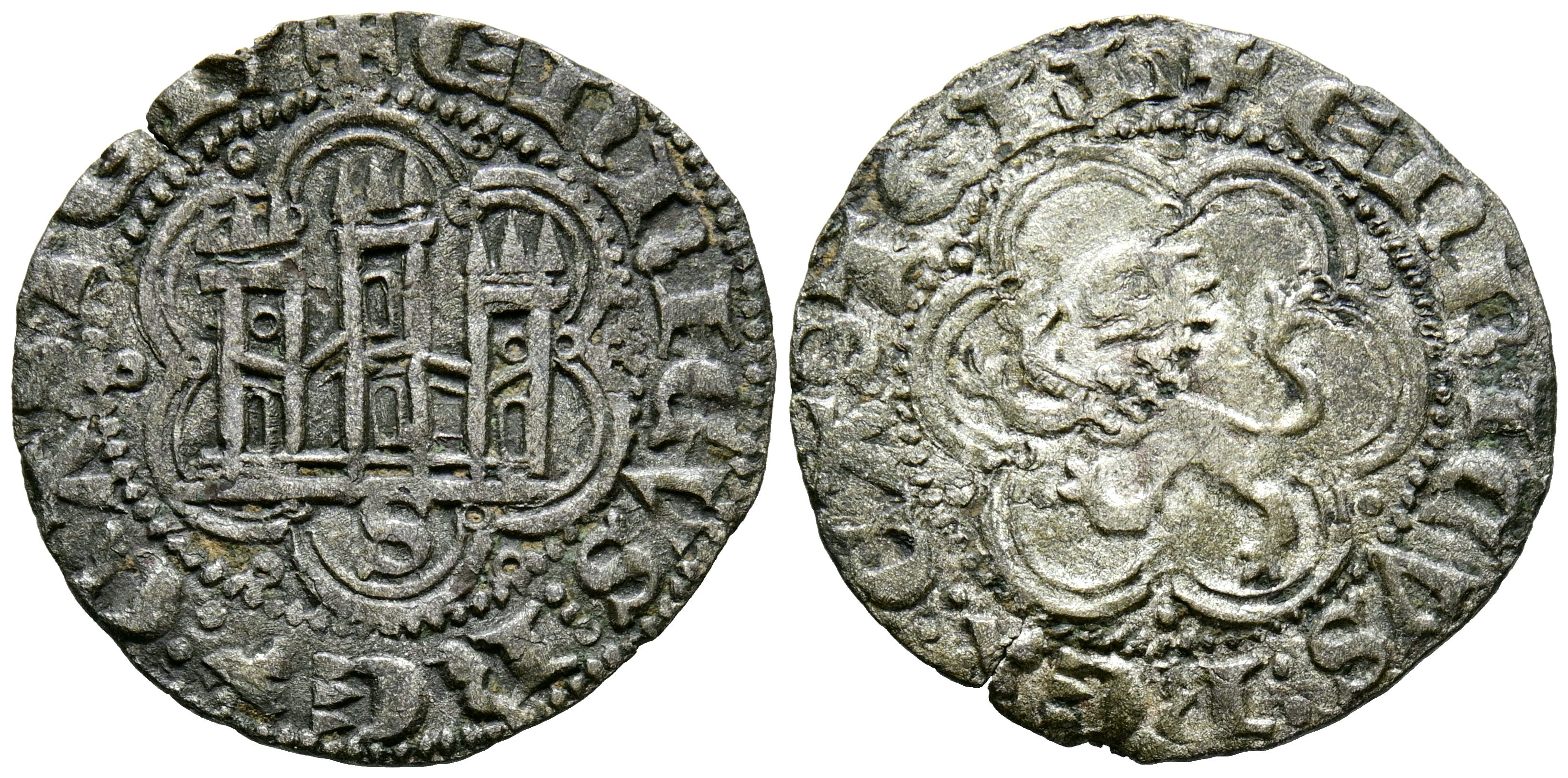 ENRIQUE III (1390-1406). Blanca. (Ae. 1,93g/24mm). Sevilla. (Imperatrix E3:1,14; FAB-602.2). Anv: Castillo, debajo S, dentro de gráfila polilobular doble, alrededor leyenda: ENRICVS REX CASTEL. Rev: León rampante a izquierda dentro de gráfila polilobular, alrededor leyenda: ENRICVS REX CASTELL. MBC. Atractivo ejemplar.