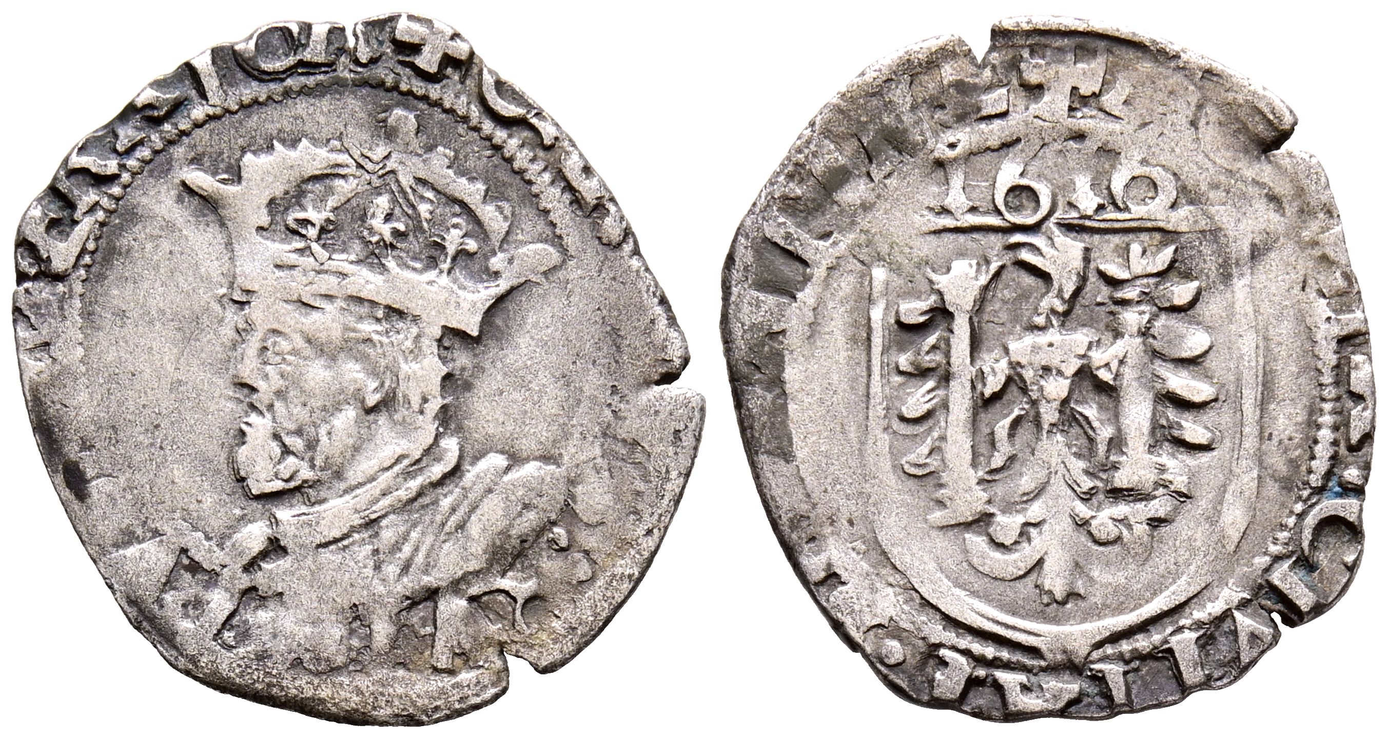 ALBERTO E ISABEL (1599-1621). 1 Carlos. (Ar. 1,21g/20mm). 1616. Besançon (Franco Condado). (Vicenti no cita, para este tipo, solamente encontramos citadas las fechas 1619 y 1624). Acuñación a nombre del Emperador Carlos V. MBC-. Rara.