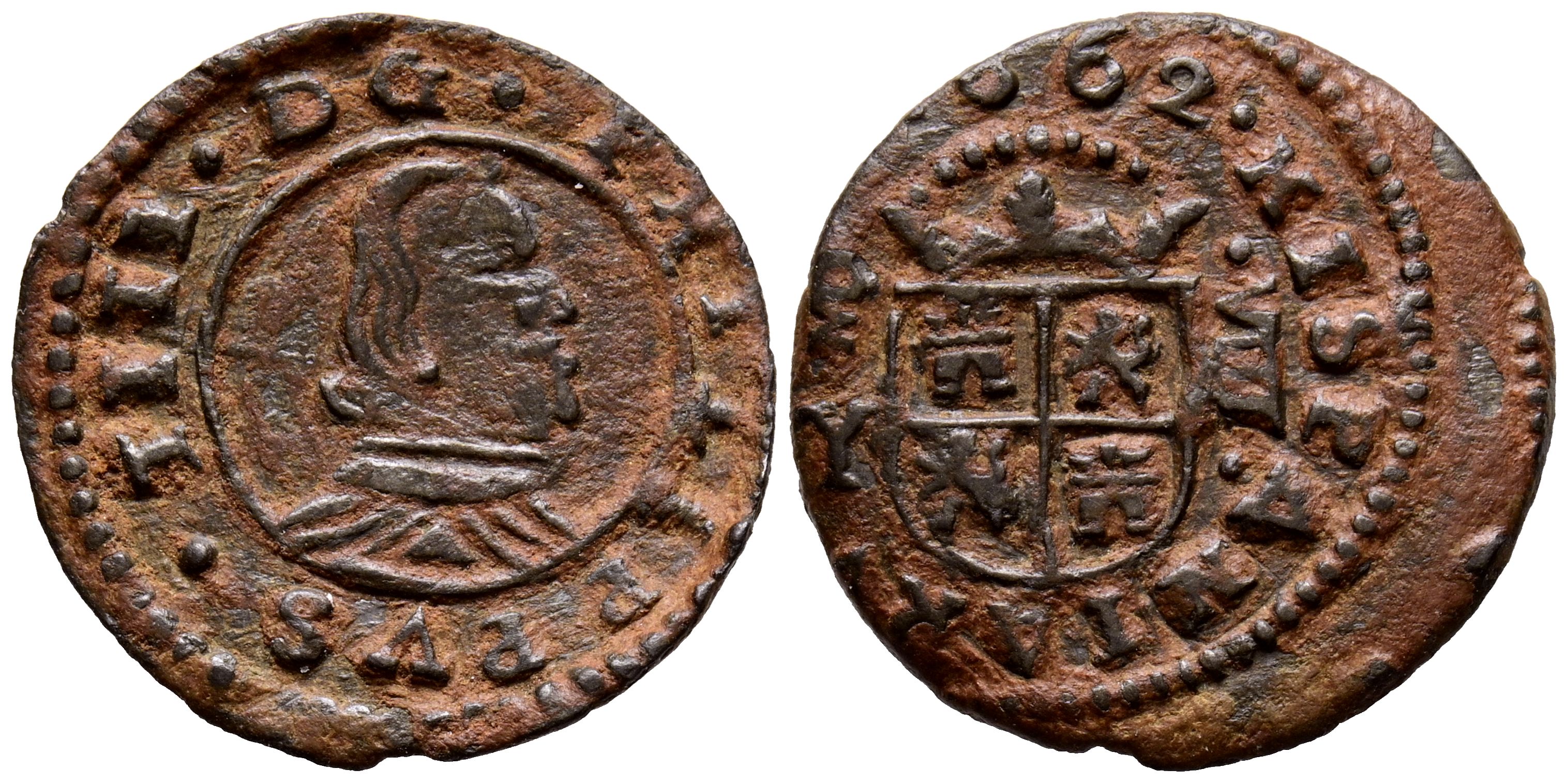 FELIPE IV (1621-1665). 8 Maravedís (Ae. 2,20g/21mm). 1662. Madrid Y. (Cal-2019-360). Marca de ceca (MD) y ensayador a izquierda. MBC+. Precioso tono.