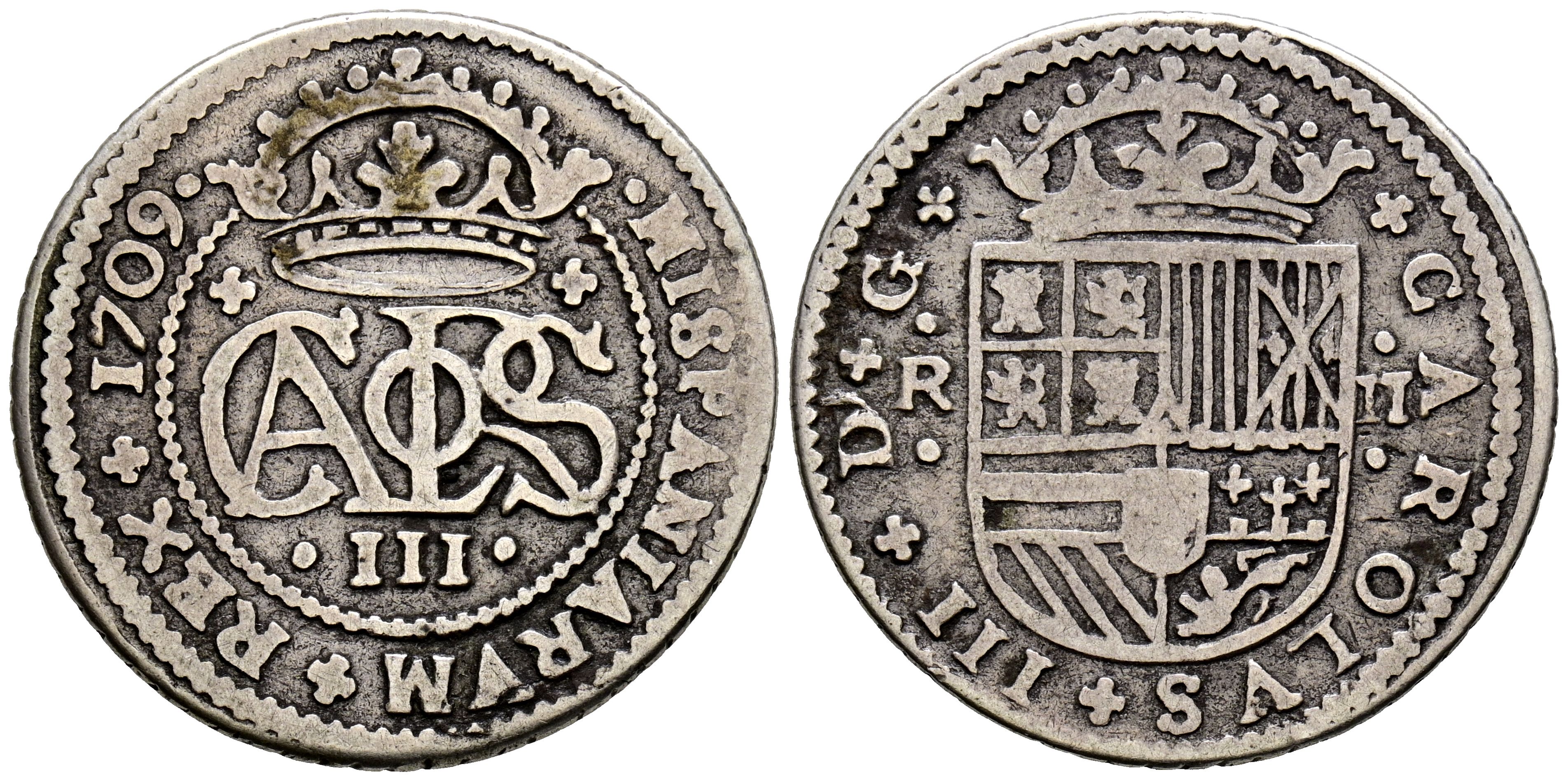 CARLOS III, el Pretendiente (1700-1714). 2 Reales. (Ar. 4,60g/27mm). 1709. Barcelona. (Cal-2019-30). MBC.