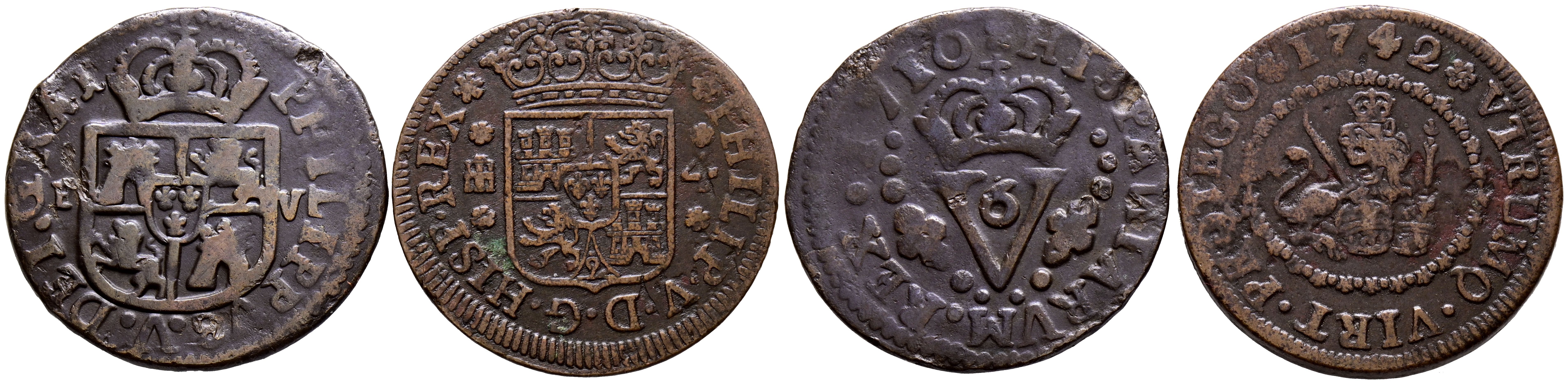 FELIPE V (1700-1746). Pareja de cobres con módulos de 4 Maravedís (Segovia, 1742) y Seiseno (Valencia, 1710) Diferentes estados de conservación. A EXAMINAR.