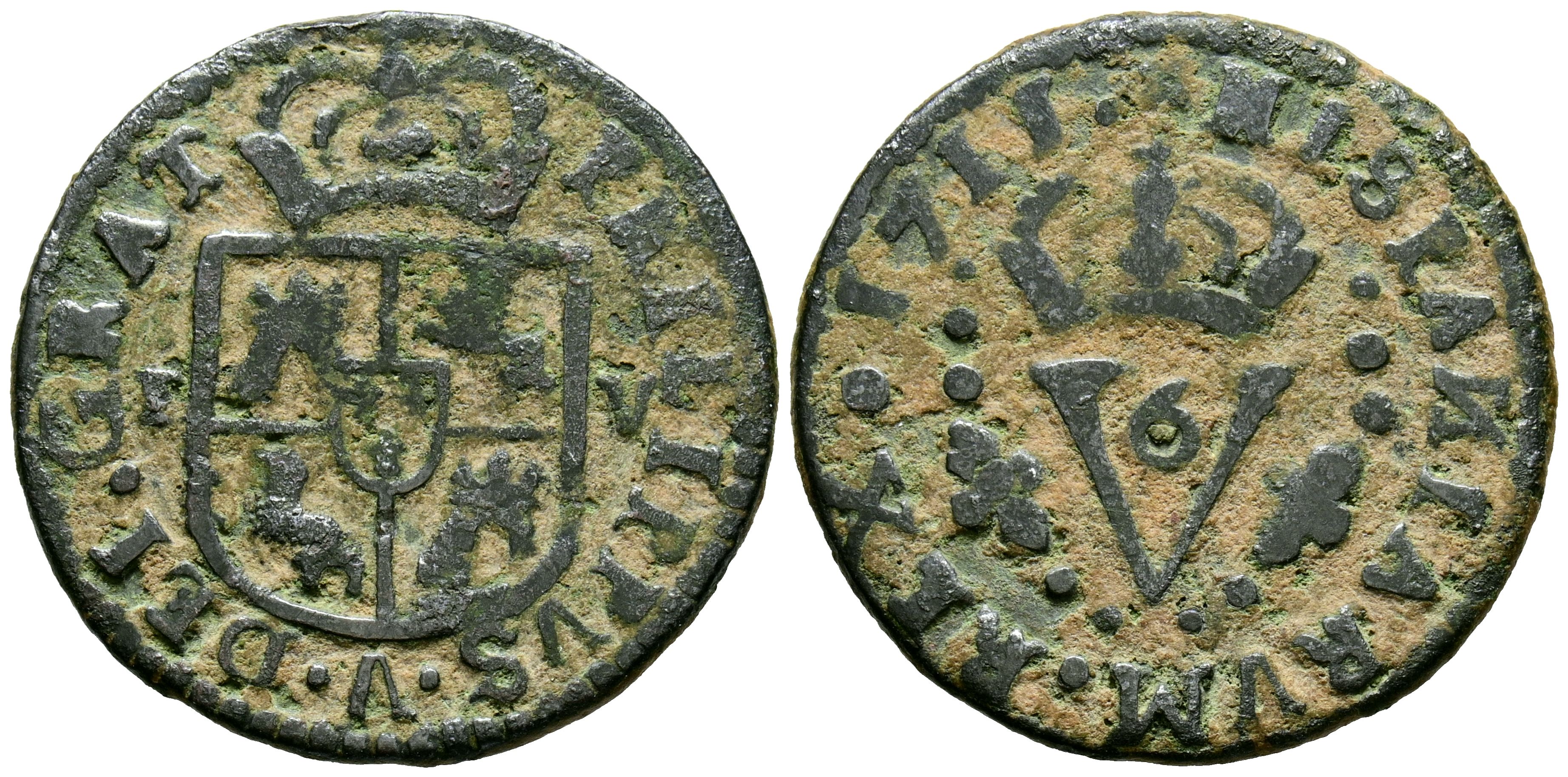 FELIPE V (1700-1746). 1 Sisó. (Ae. 5,70g/26mm). 1711. Valencia. (Cal-2019-13). MBC-.