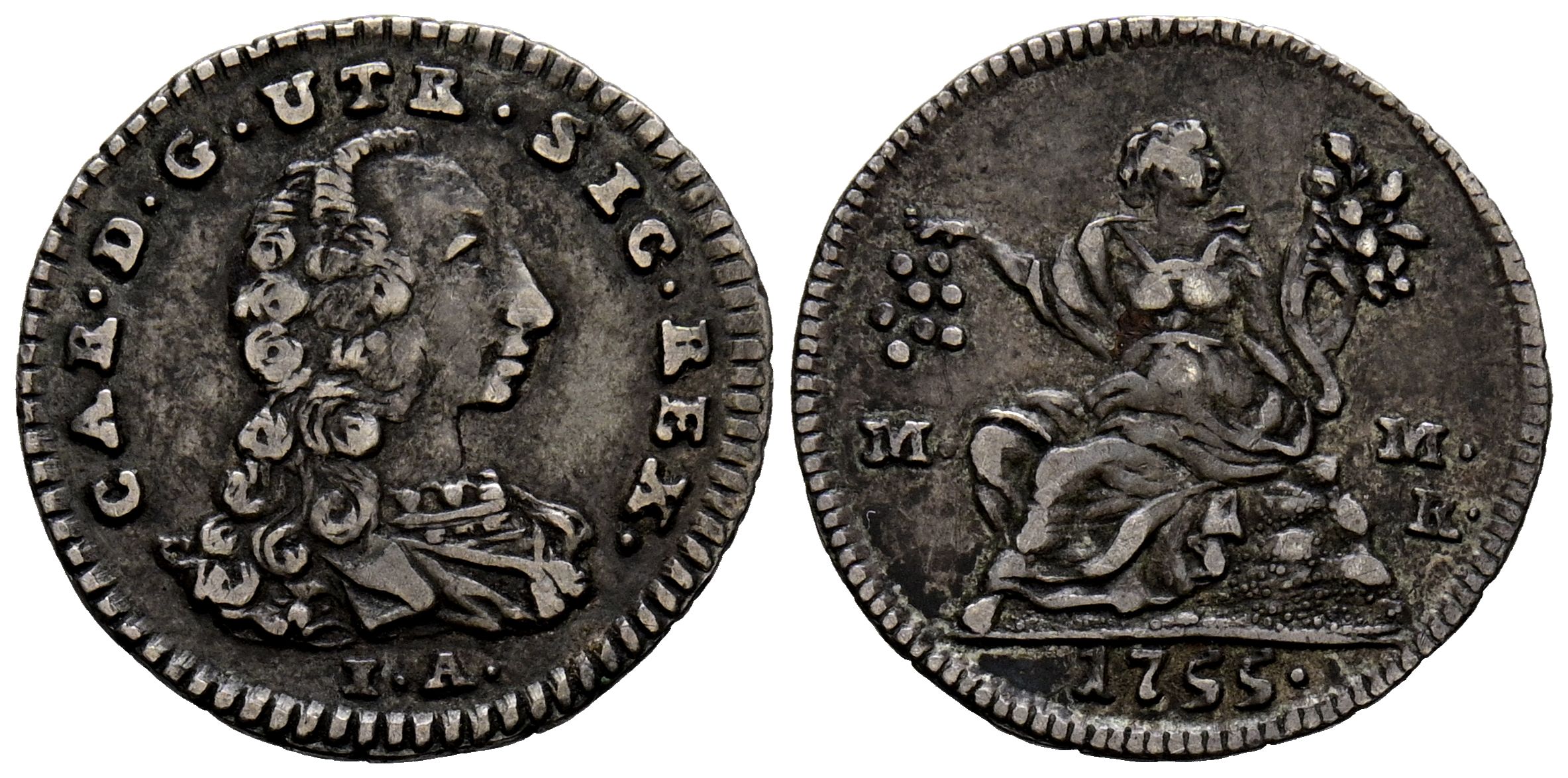 CARLOS III (1759-1788). 1/2 Carlino. (Ar. 1,04g/16mm). 1755. Nápoles. (Vicenti 126; MIR 342/1). MBC+. Atractiva pátina oscura. Interesante ejemplar.