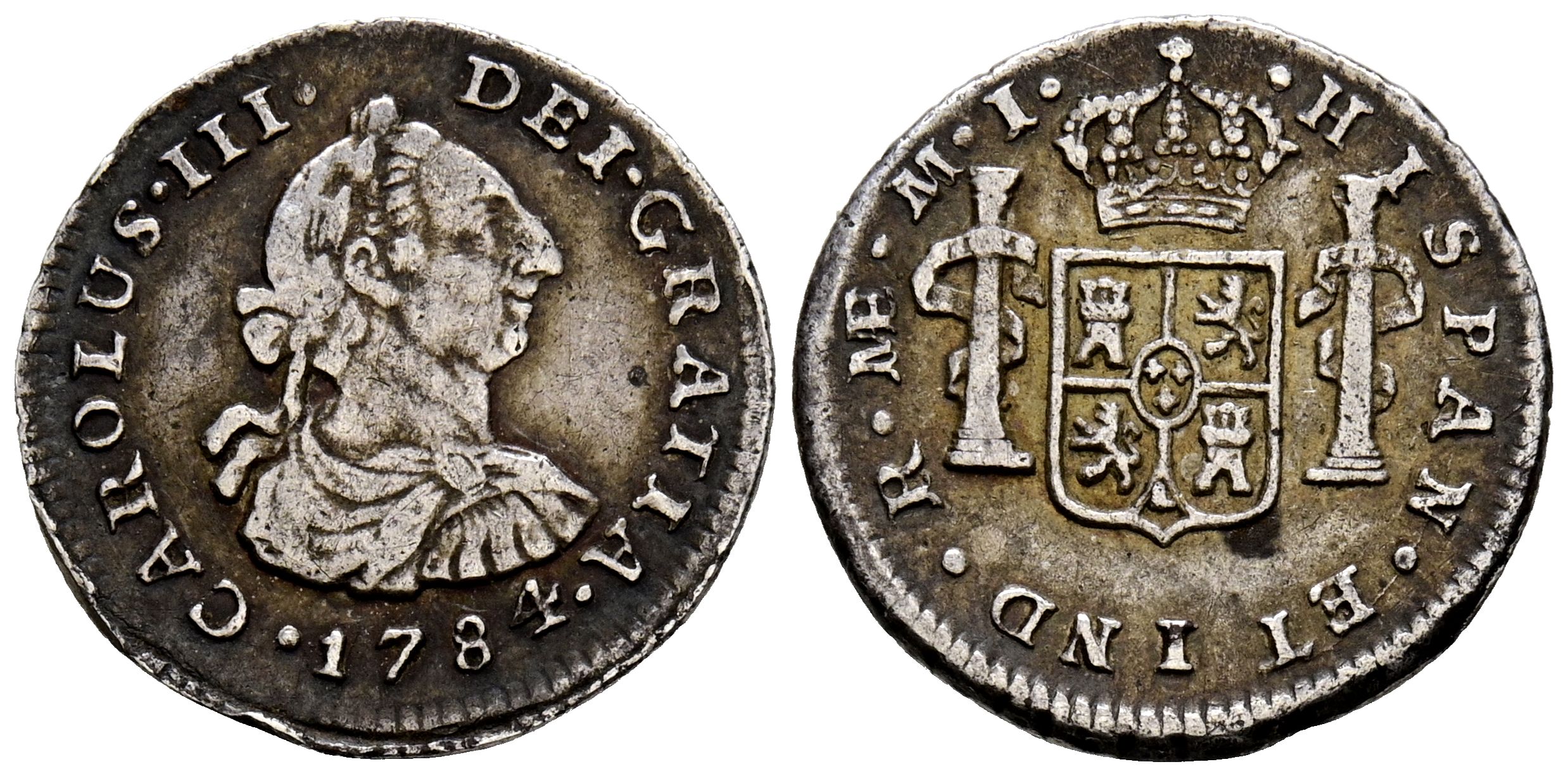 CARLOS III (1759-1788). 1/2 Real. (Ar. 1,58g/17mm). 1784. Lima MI. (Cal-2019-141). MBC. Pátina dorada.