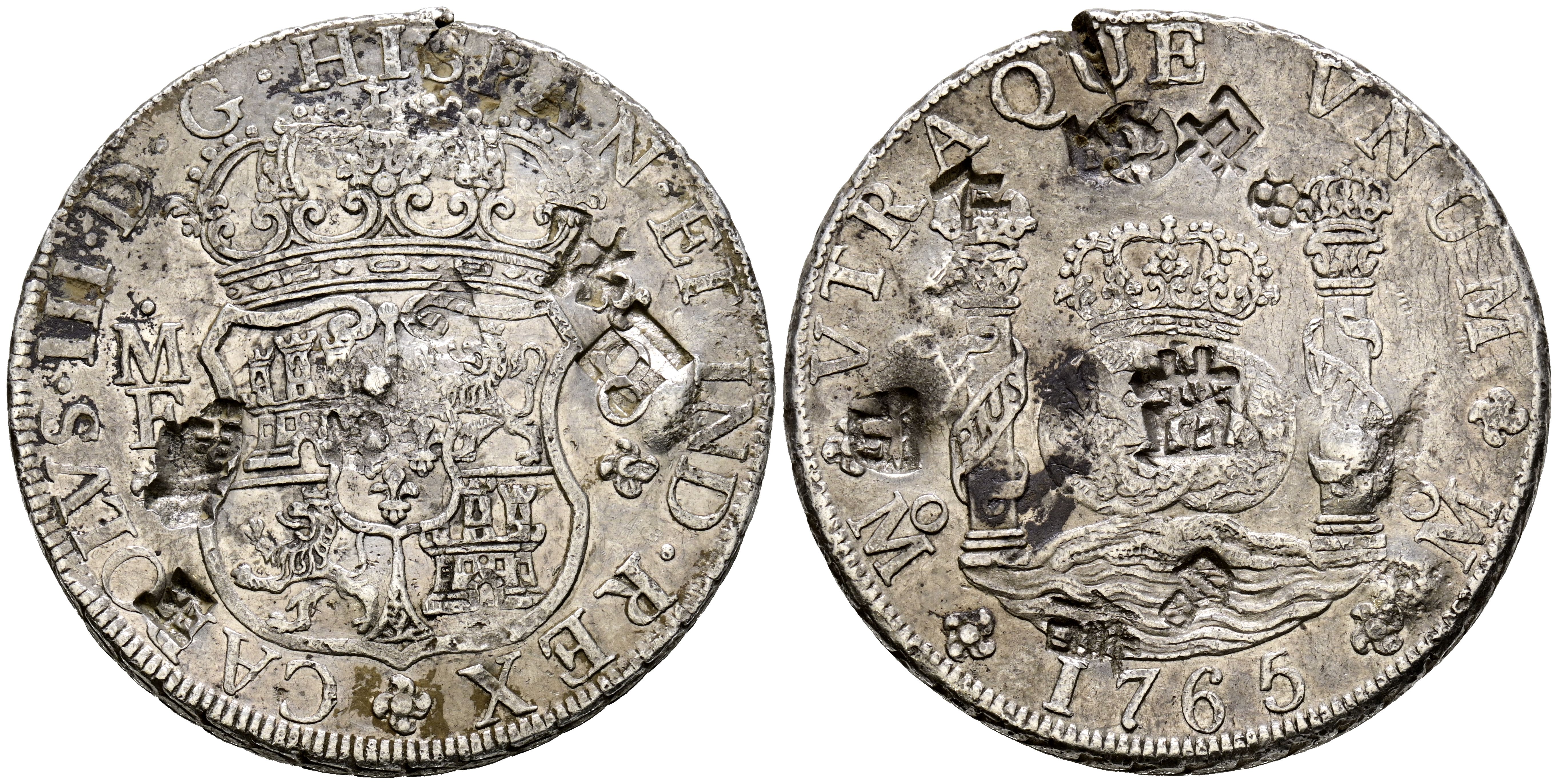 CARLOS III (1759-1788). 8 Reales (Ar. 26,93g/38mm). 1765. México MF. (Cal-2019-1088). MBC+. Resellos orientales.