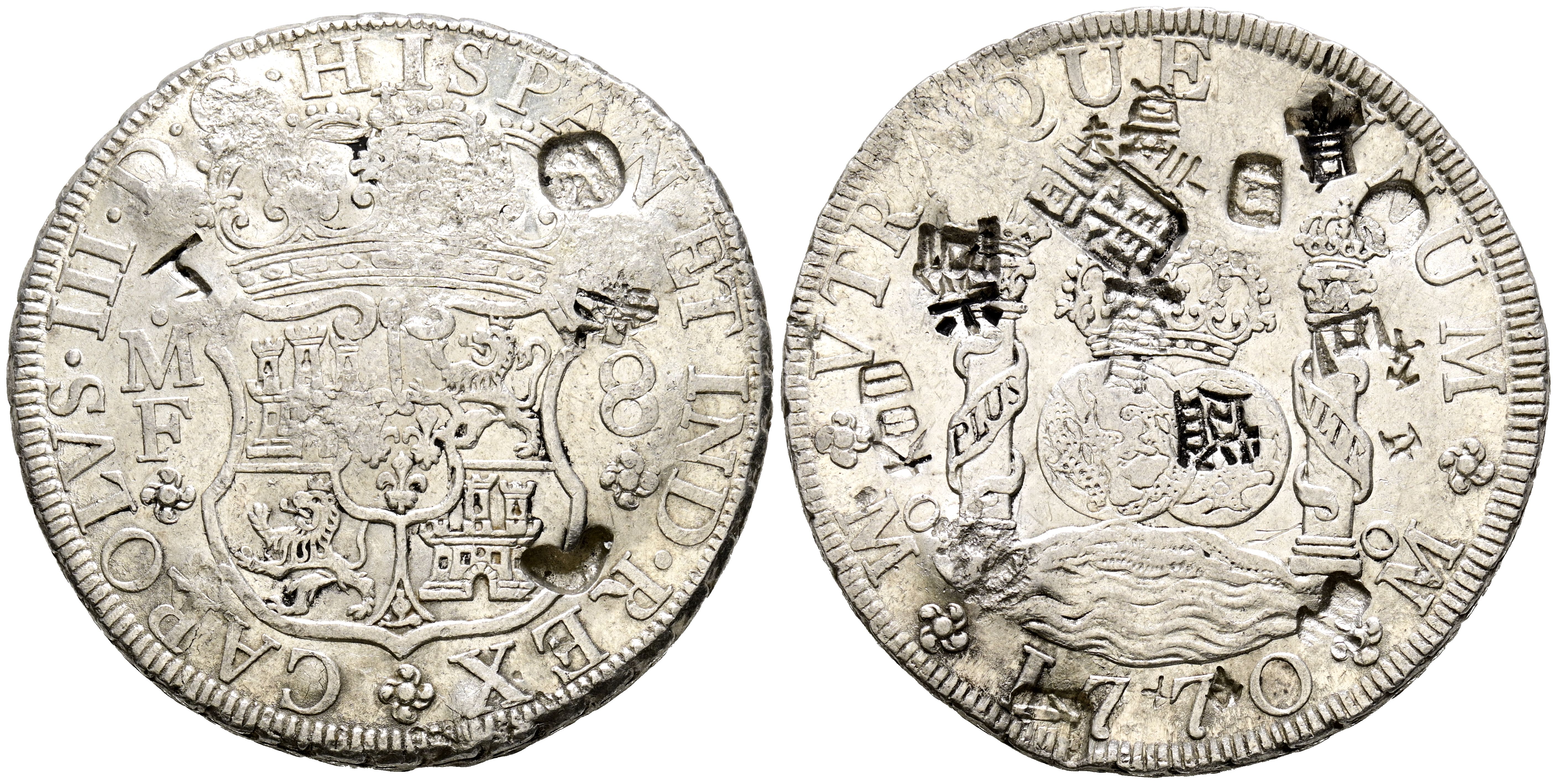CARLOS III (1759-1788). 8 Reales (Ar. 26,88g/38mm). 1770. México MF. (Cal-2019-1099). MBC+. Resellos orientales.