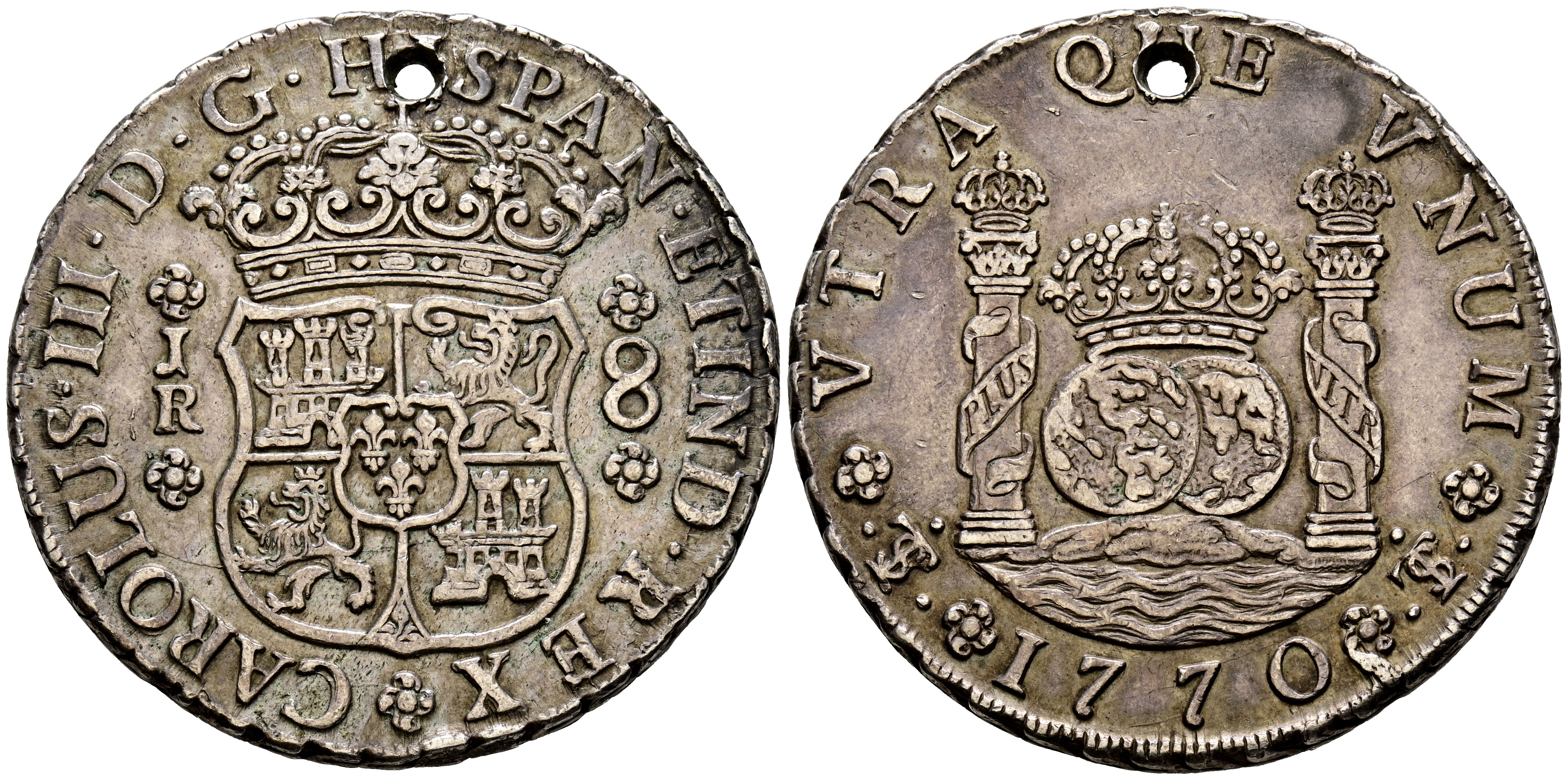 CARLOS III (1759-1788). 8 Reales. (Ar. 26,84g/39mm). 1770. Potosí JR. (Cal-2019-1168). EBC-. Perforación a las 12h. Bonita pátina.