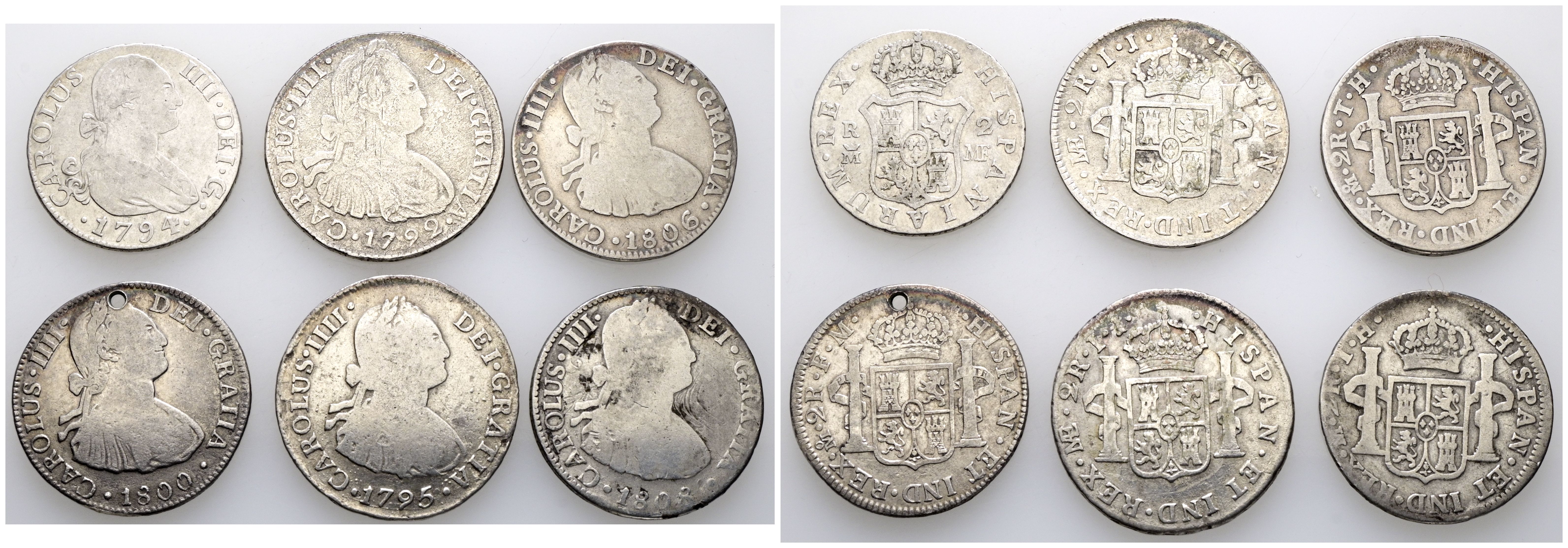 CARLOS IV (1788-1808). Interesante conjunto de 6 monedas de 2 Reales con fechas distintas, sin repeticiones, y de las cecas de Lima (2), México (3) y Madrid (1). Diferentes estados de conservación. A EXAMINAR.