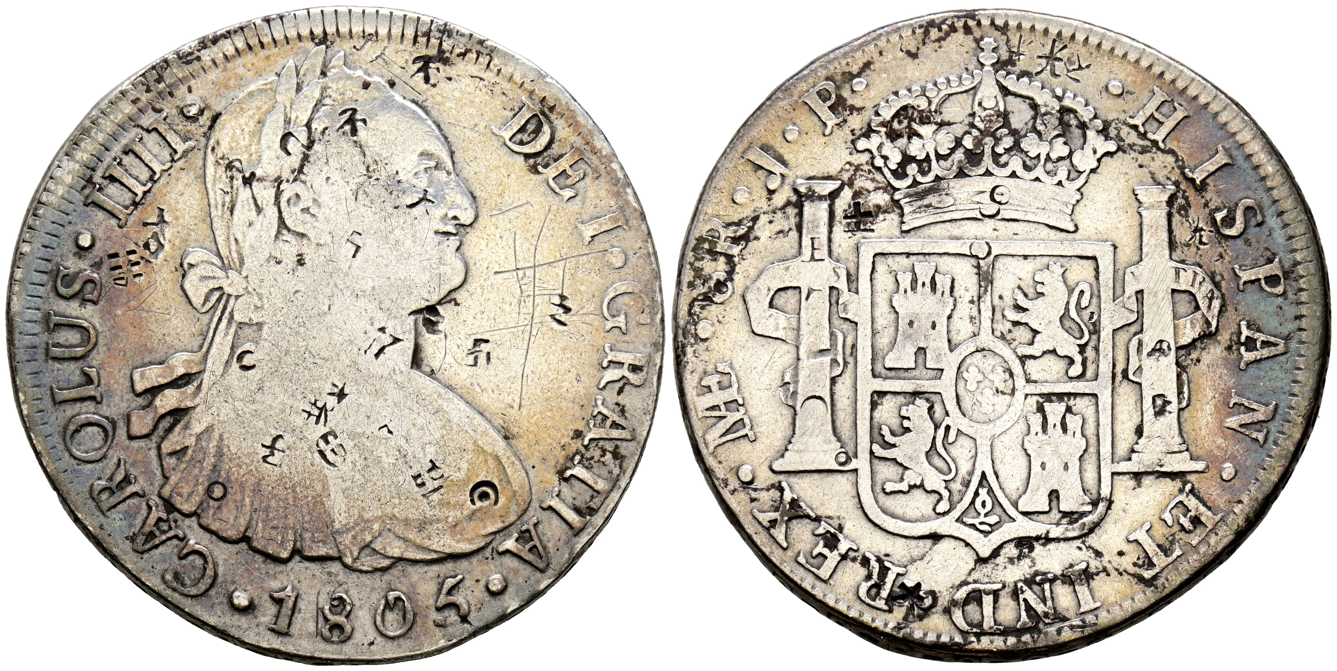 CARLOS IV (1788-1808). 8 Reales. (Ar. 26,34g/39mm). 1805. Lima JP. (Cal-2019-925). BC+. Resellos orientales. Limpiada pero con bonita pátina.