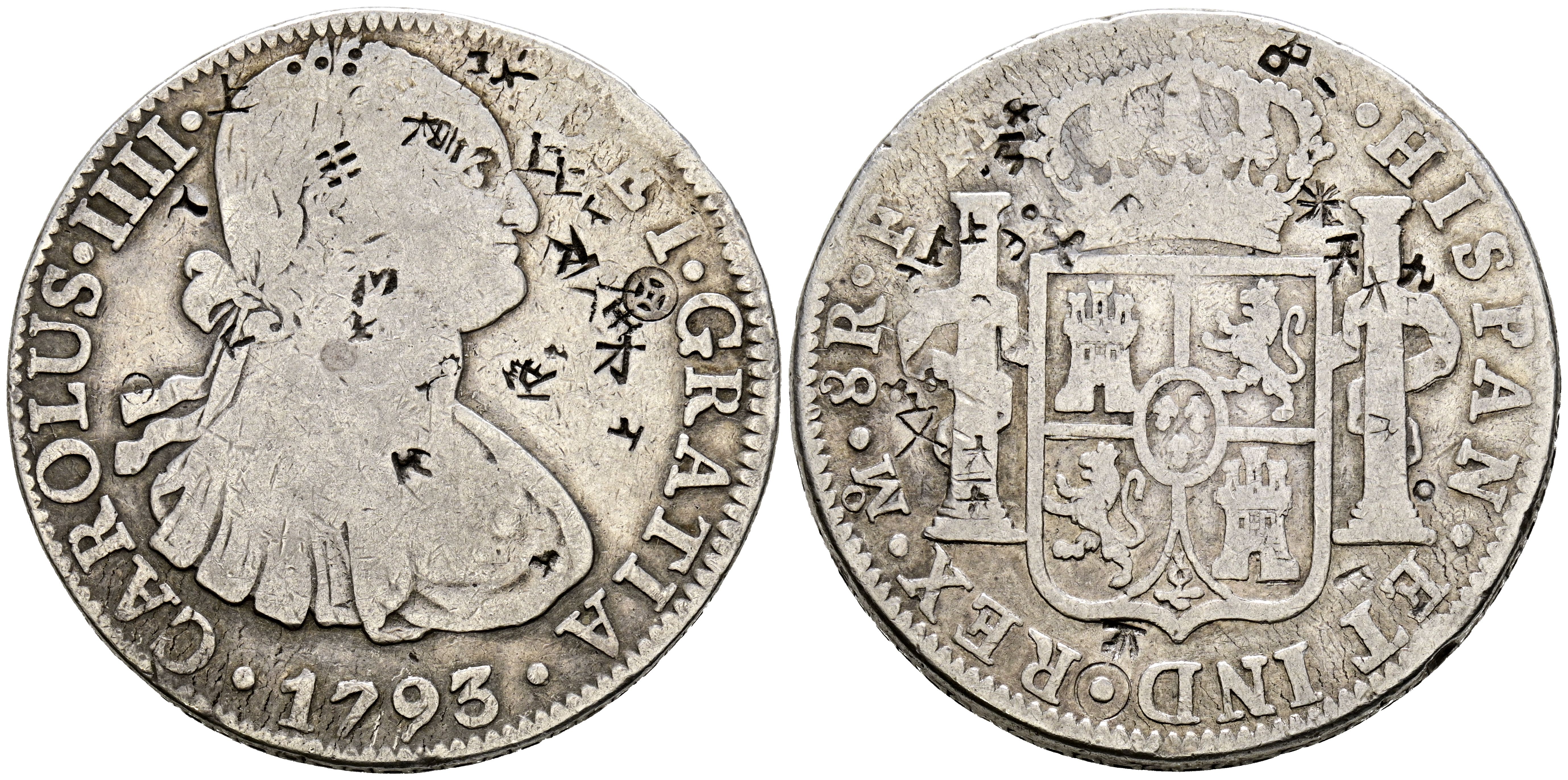 CARLOS IV (1788-1808). 8 Reales. (Ar. 26,50g/39mm). 1793. México FM. (Cal-2019-955). BC+. Resellos orientales.