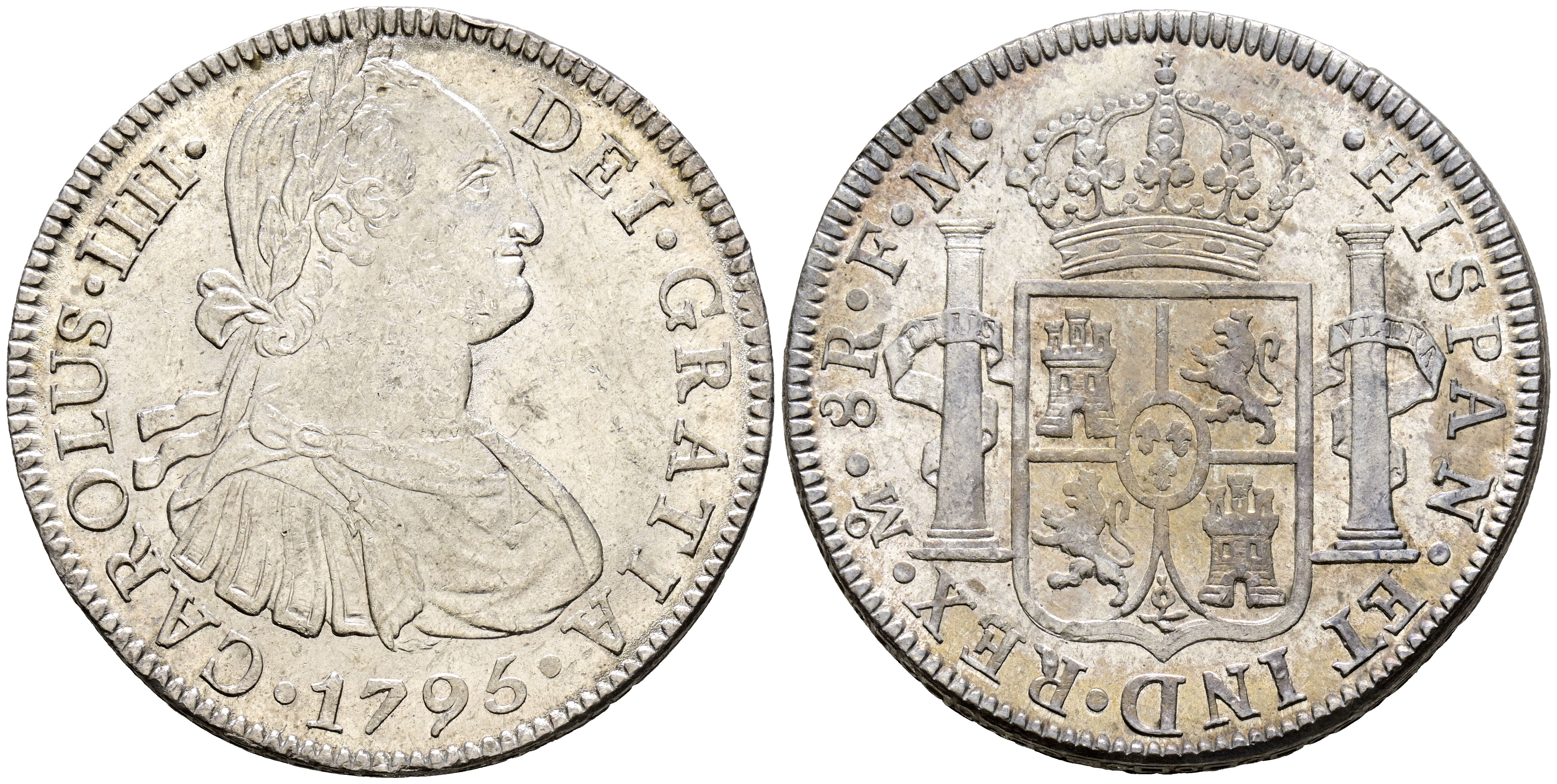 CARLOS IV (1788-1808). 8 Reales (Ar. 27,04g/39mm). 1795. México FM. (Cal-2019-958). EBC-/EBC. Restos de brillo original. Precioso reverso.