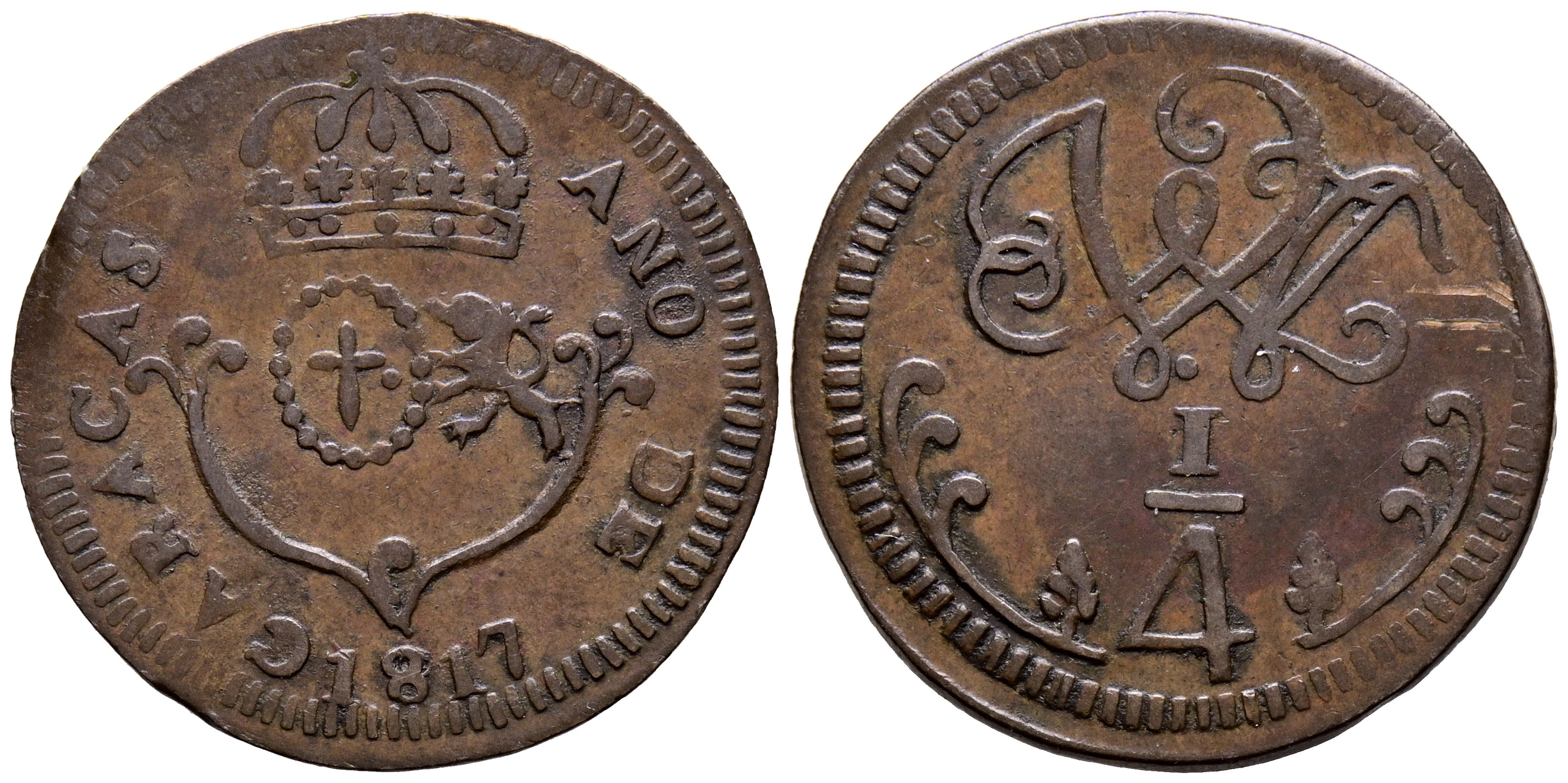 FERNANDO VII (1808-1833). Cuarto. (Ae. 2,94g/24mm). 1817. Caracas. (Cal-2019-66). Fecha pequeña. MBC+. Escasa.