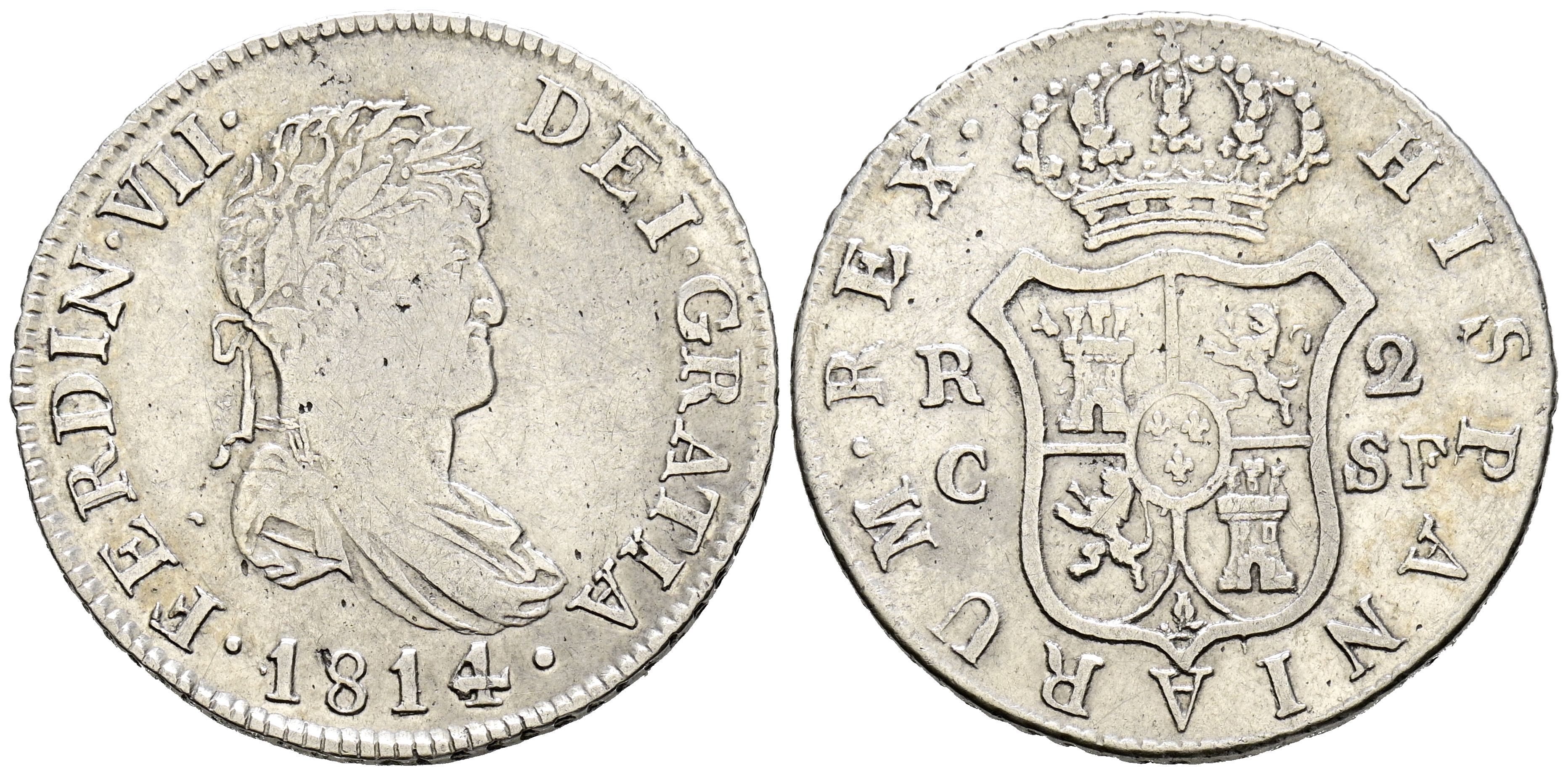 Fernando VII (1808-1833). 2 reales. (Ar. 5,79g/26mm). 1814. Cataluña (Acuñada en Mallorca). SF. (Cal-769). MBC-. Limpiada. Escasa.
