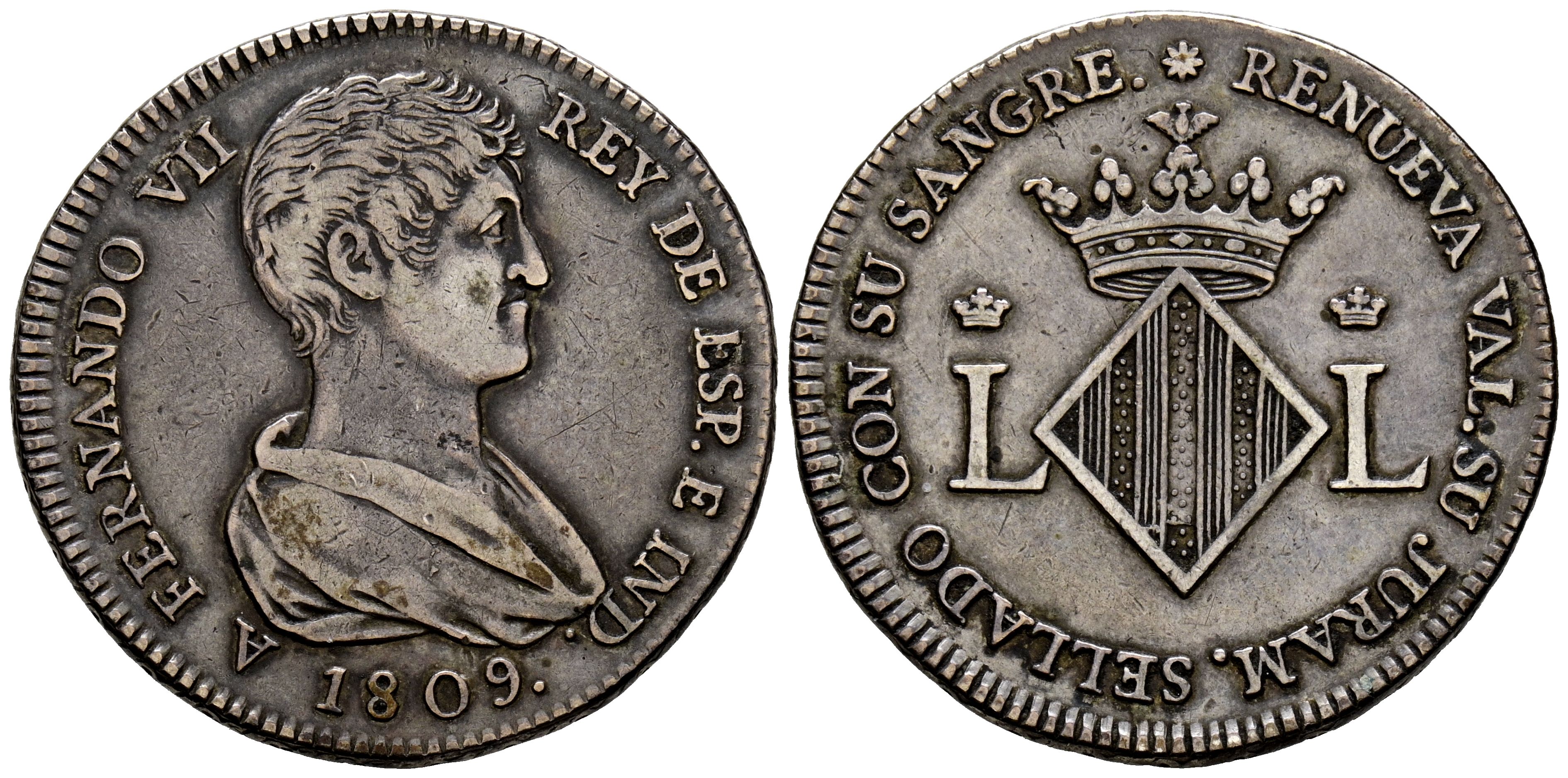 FERNANDO VII (1808-1833). Proclamación en Valencia, módulo de 2 Reales. (Ar. 7,14g/27mm). 1809. (Vives 721). Anv: Busto drapeado de Fernando VII, alrededor leyenda: A FERNANDO VII REY DE ESP E IND 1809. Rev: Escudo coronado de Valencia entre L coronadas, alrededor leyenda: RENUEVA VAL SU JURAM SELLADO CON SU SANGRE. MBC.