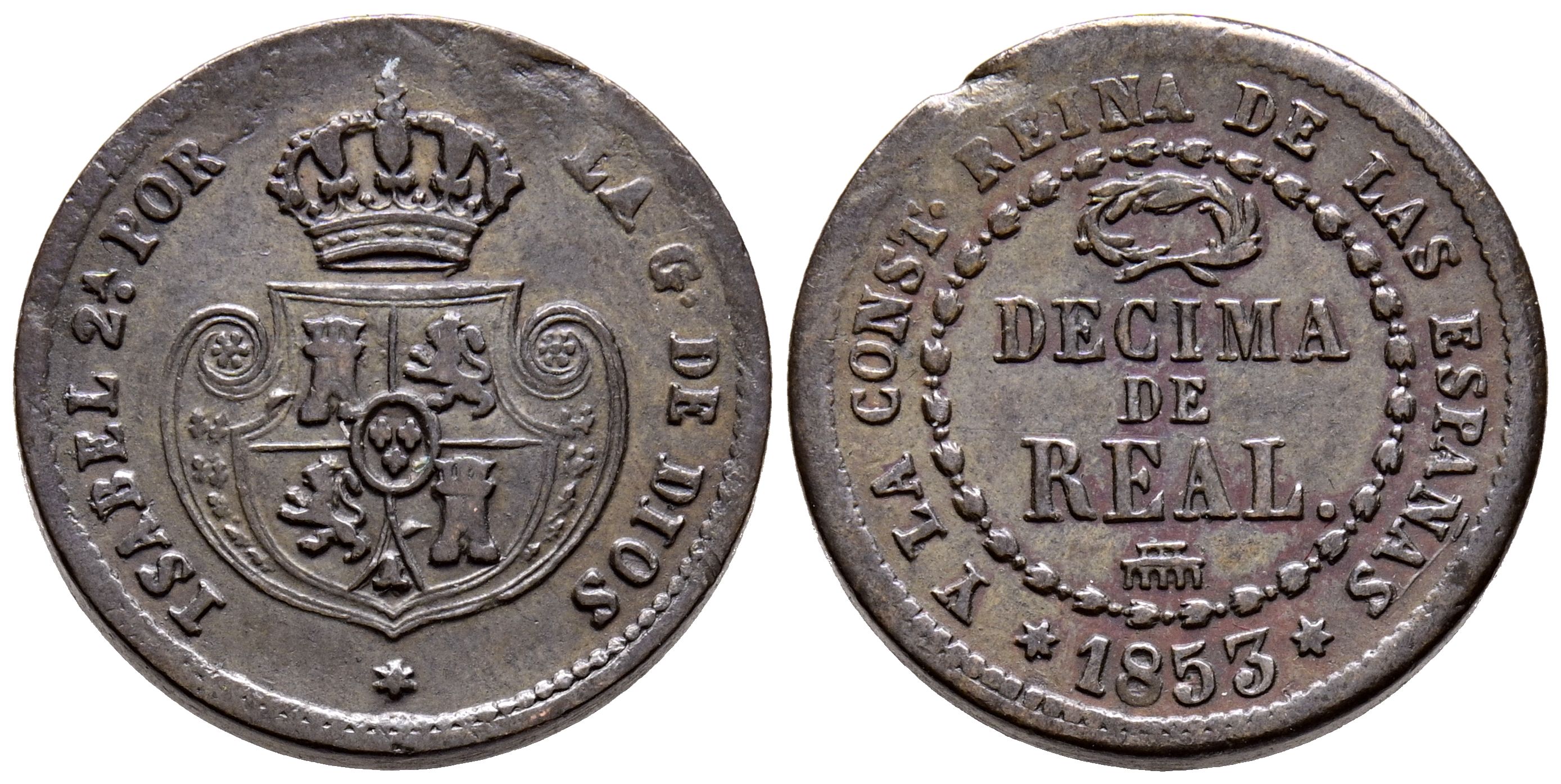 ISABEL II (1833-1688). 1 Décima de Real. (Ae. 3,70g/19mm). 1853. Segovia. (Cal-2019-146). MBC+. Muesca en canto.
