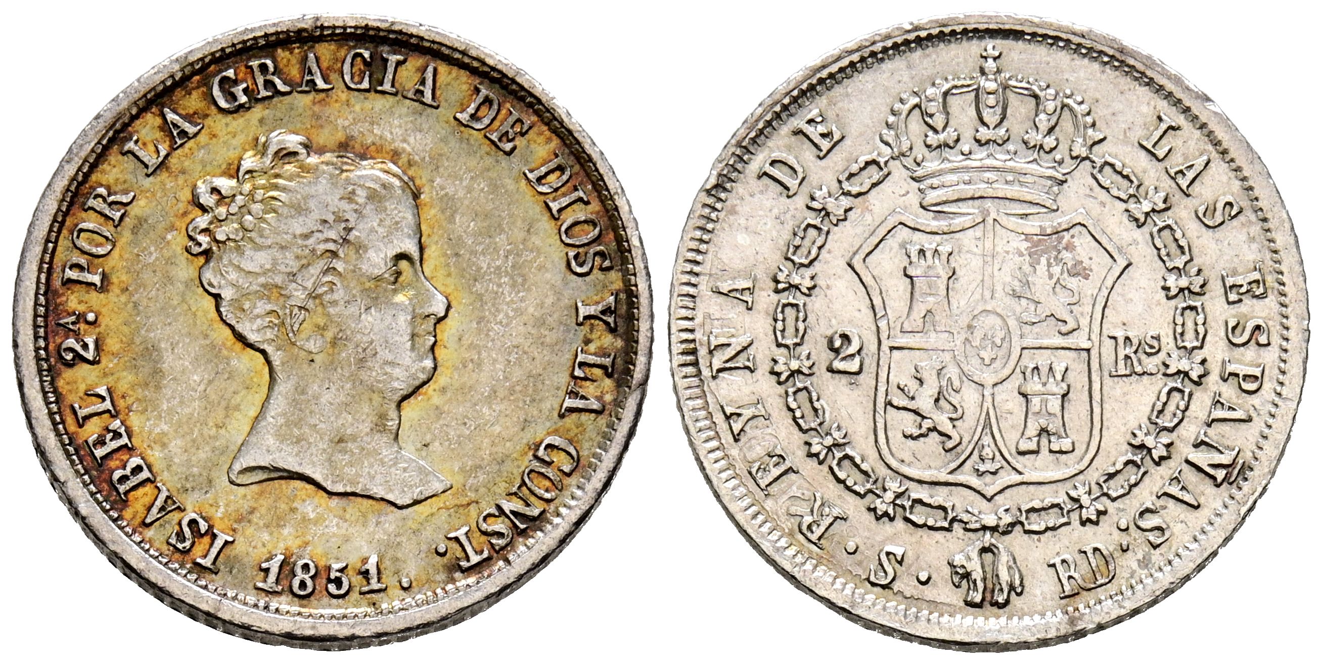 ISABEL II (1833-1868). 2 Reales. (Ar. 2,50g/18mm). 1851. Sevilla RD. (Cal-2019-388). MBC+. Parte de la leyenda del anverso incusa en reverso. Atractiva pátina dorada en anverso, muy bonito ejemplar.