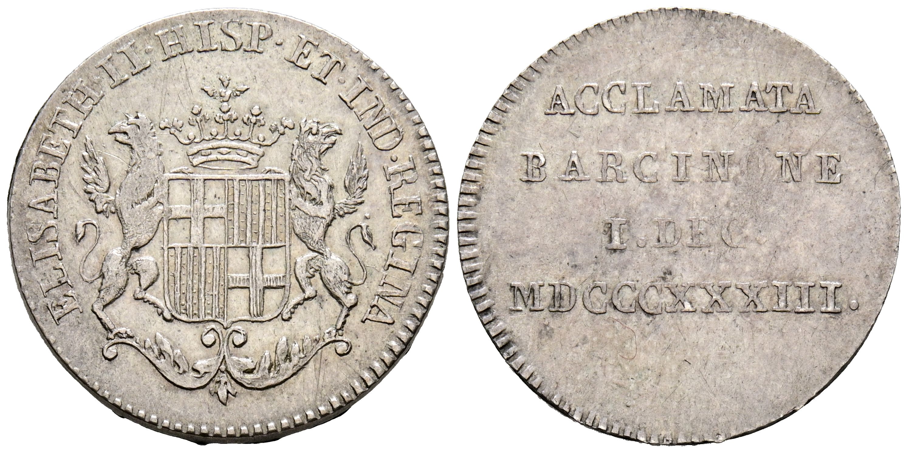 ISABEL II (1833-1868). Proclamación en Barcelona (Ar. 3,60g/23mm). 1833 . Módulo de 1 Real. (Ha. 6). MBC+.
