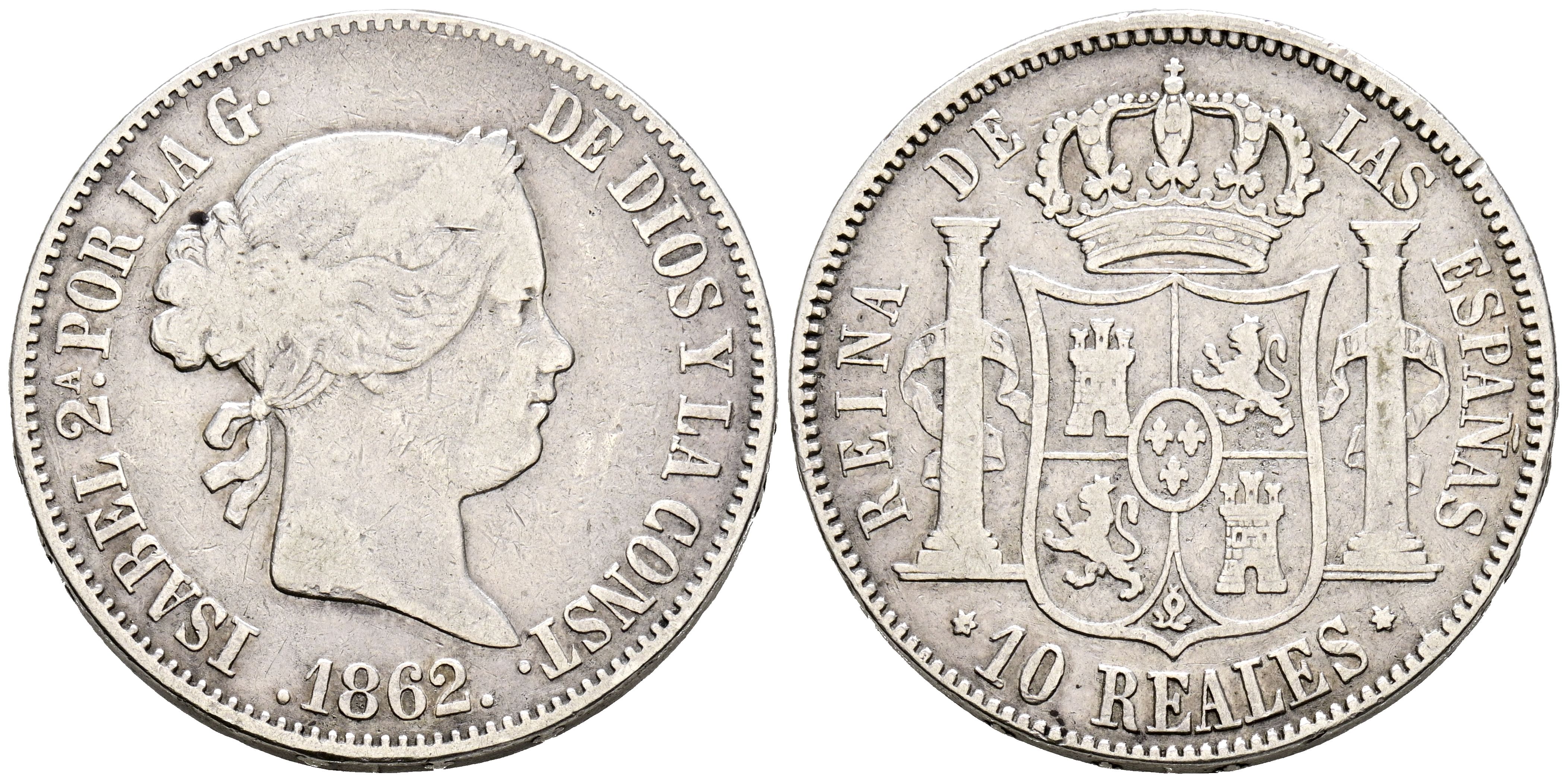 ISABEL II (1833-1868). 10 Reales. (Ar. 12,76g/30mm). 1862. Madrid. (Cal-2019-539). BC+.