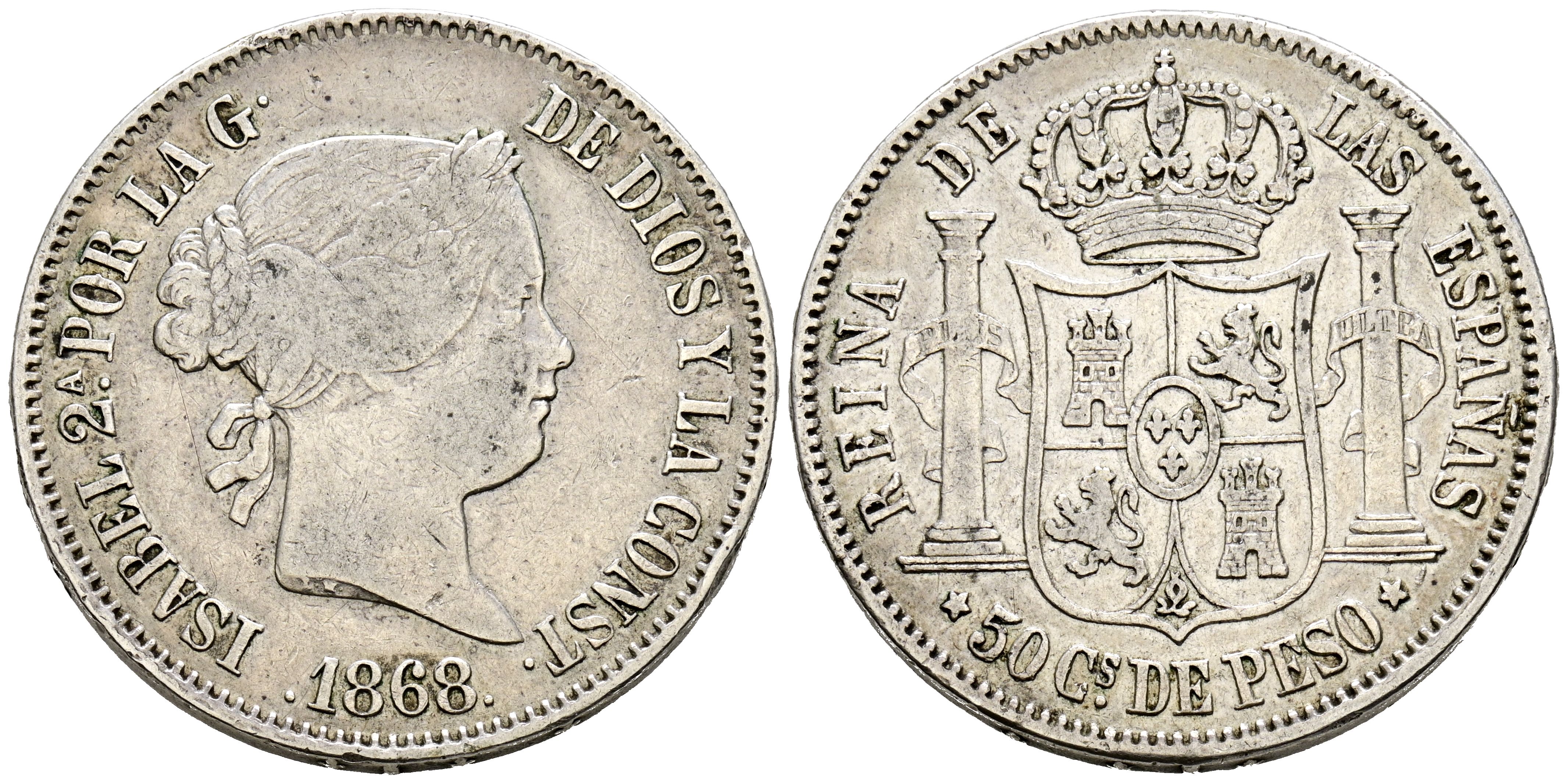 ISABEL II (1833-1868). 50 Centavos de Peso. (Ar. 12,90g/30mm). 1868. Manila. (Cal-2019-667). MBC-.