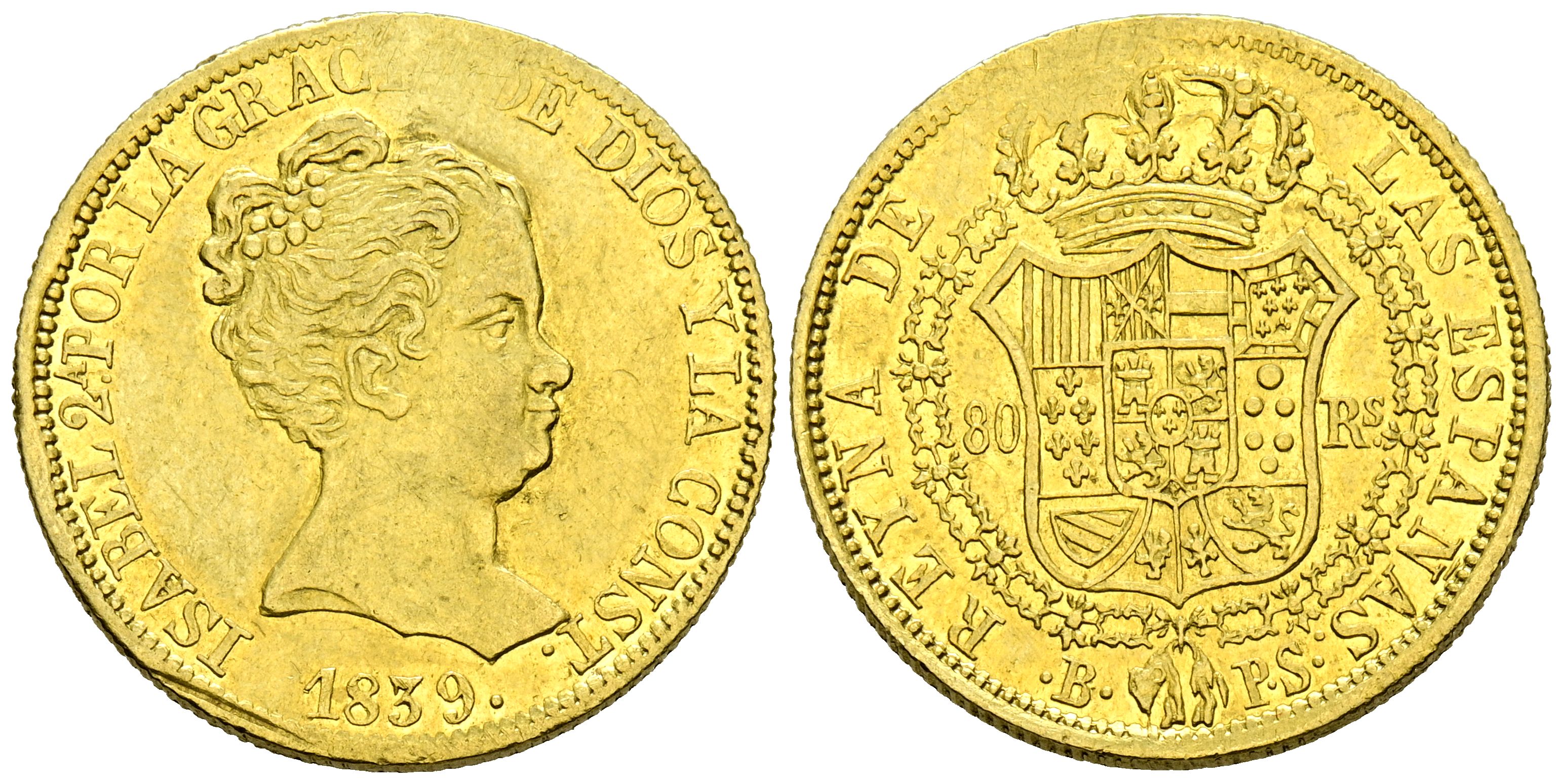 ISABEL II (1833-1868). 80 Reales (Au. 6,75g /21mm). 1839. Barcelona PS. (Cal-2019-704). EBC-.