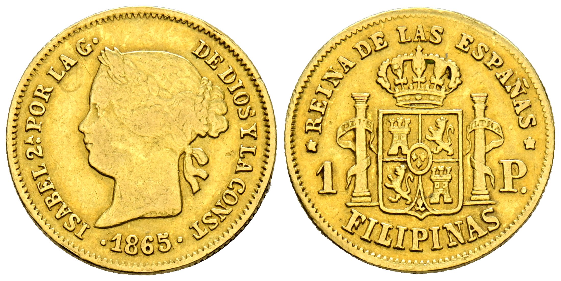 ISABEL II (1833-1868). 1 Peso. (Au. 1,66g/15mm). 1865. Manila. (Cal-2019-829). MBC.