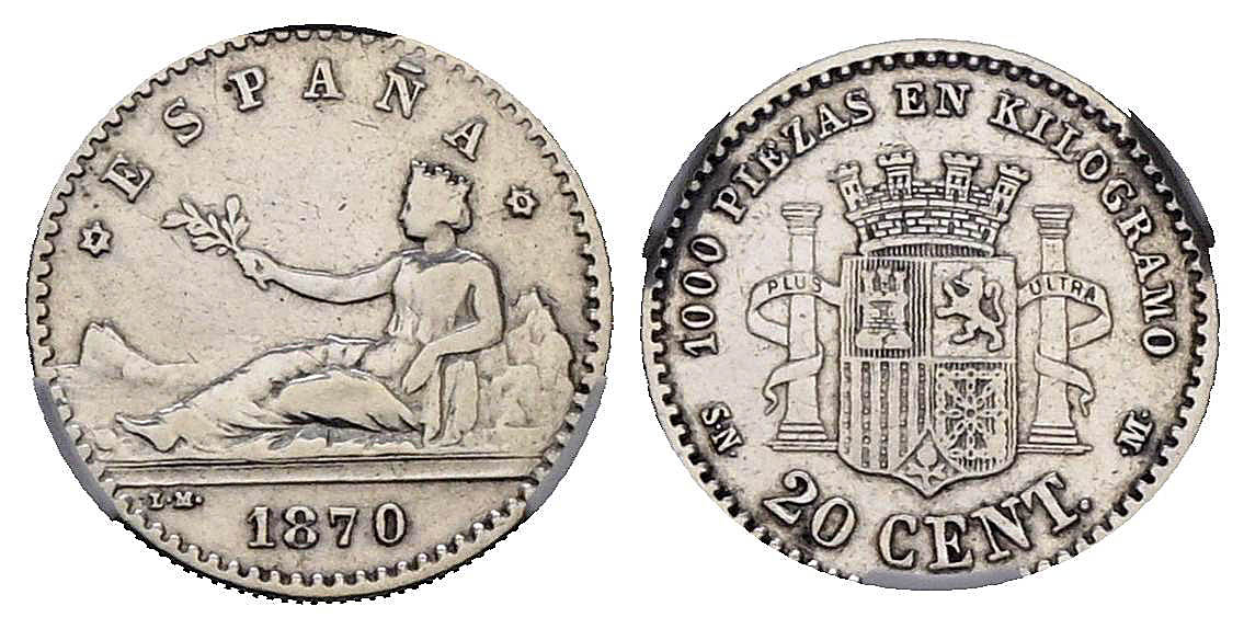 GOBIERNO PROVISIONAL (1868-1871). 20 Céntimos. (Ar. 0,97g/16mm). 1870 *70. Madrid SNM. Encapsulada por NCV VF 30, Cleaned. Escaso ejemplar.