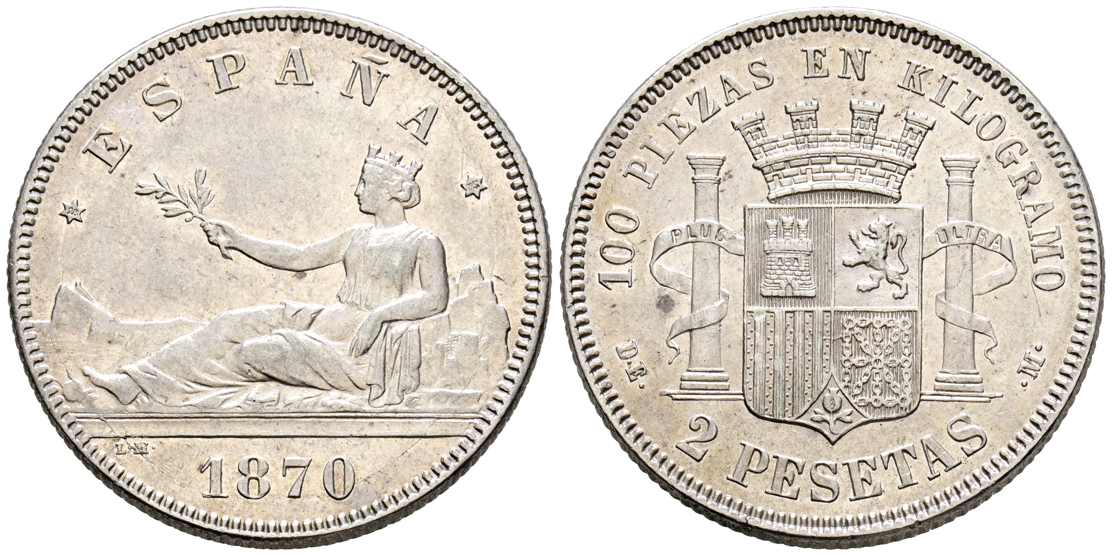 GOBIERNO PROVISIONAL (1868-1871). 2 Pesetas. (Ar. 9,91g/27mm). 1870 *18-75. Madrid DEM. (Cal-2019-33). EBC-. Acuñada ya en el reinado de Alfonso XII.