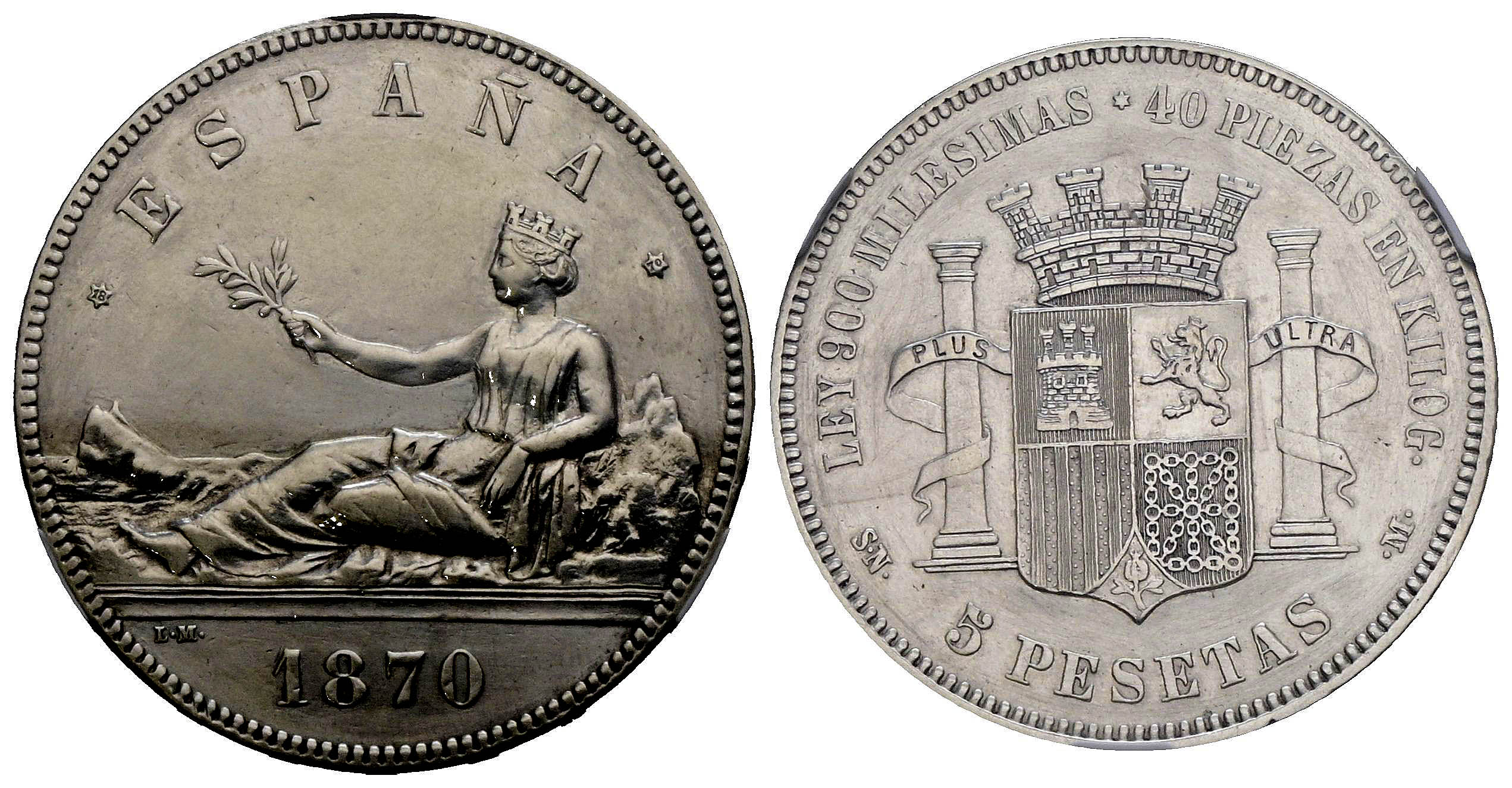GOBIERNO PROVISIONAL (1868-1871). 5 Pesetas. (Ar. 24,84g/37mm). 1870 *18-70. Madrid SNM. (Cal-2019-39). Encapsulada por NCV AU 50 "Hairlines".