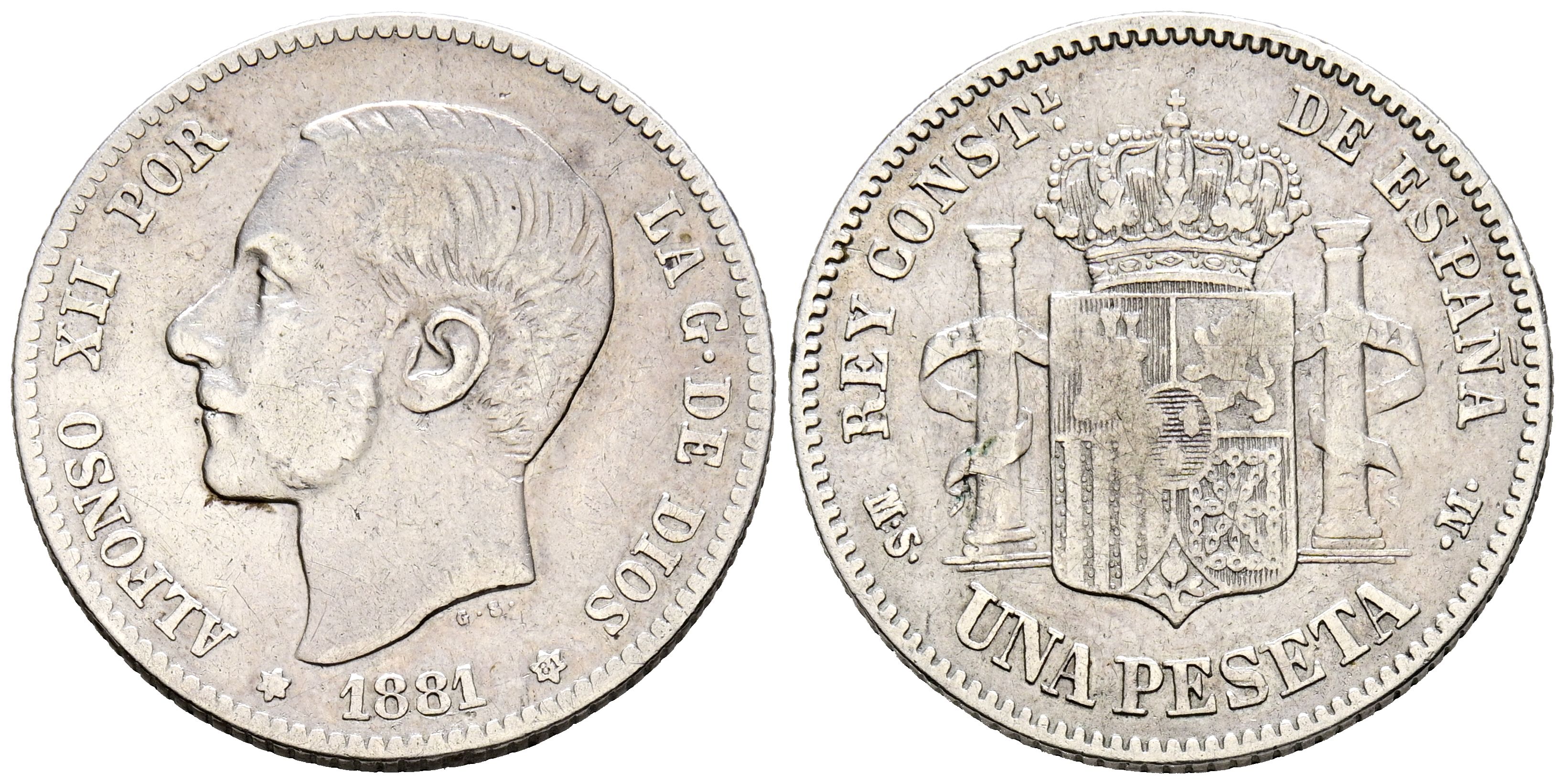 ALFONSO XII (1874-1885). 1 Peseta. (Ar. 4,93g/23mm). 1881 *18-81. Madrid MSM. (Cal-2019-17). MBC-/BC+. Primera estrella floja. Escasa.