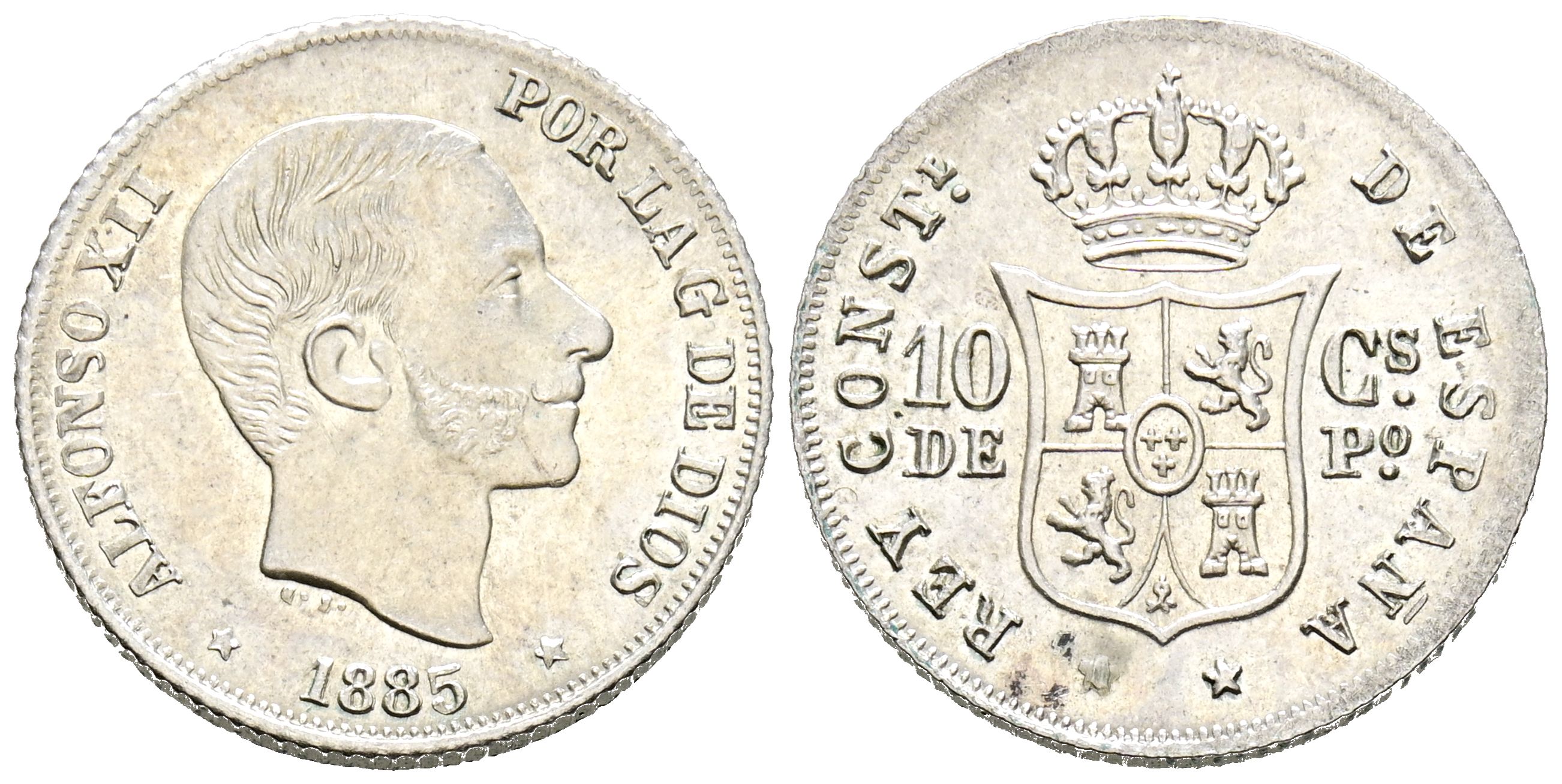 ALFONSO XII (1874-1885). 10 Centavos. (Ar. 2,53g/18mm). 1885. Manila. (Cal-2019-102). EBC+. Brillo original. Bonito ejemplar.