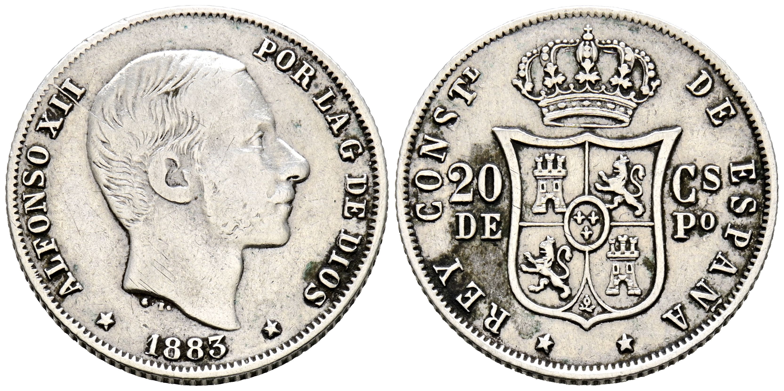 ALFONSO XII (1874-1885). 20 Centavos. (Ar. 5,15g/23mm). 1883. Manila. (Cal-2019-109). MBC-.