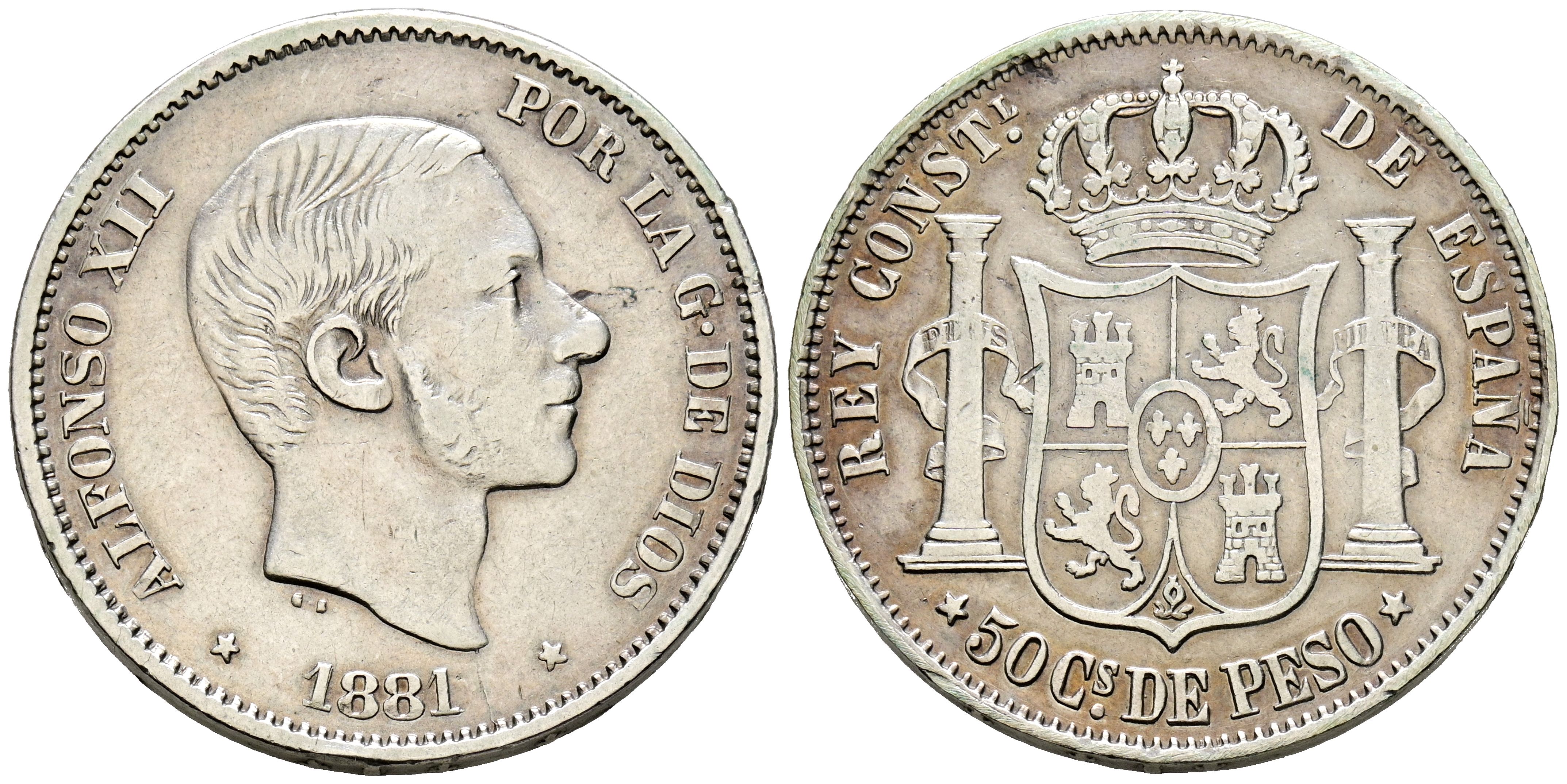 ALFONSO XII. (1874-1885). 50 Centavos. (Ar. 12,77g/30mm). 1881. Manila. (Cal-2019-114). MBC. Bonita pátina dorada especialmente en reverso.