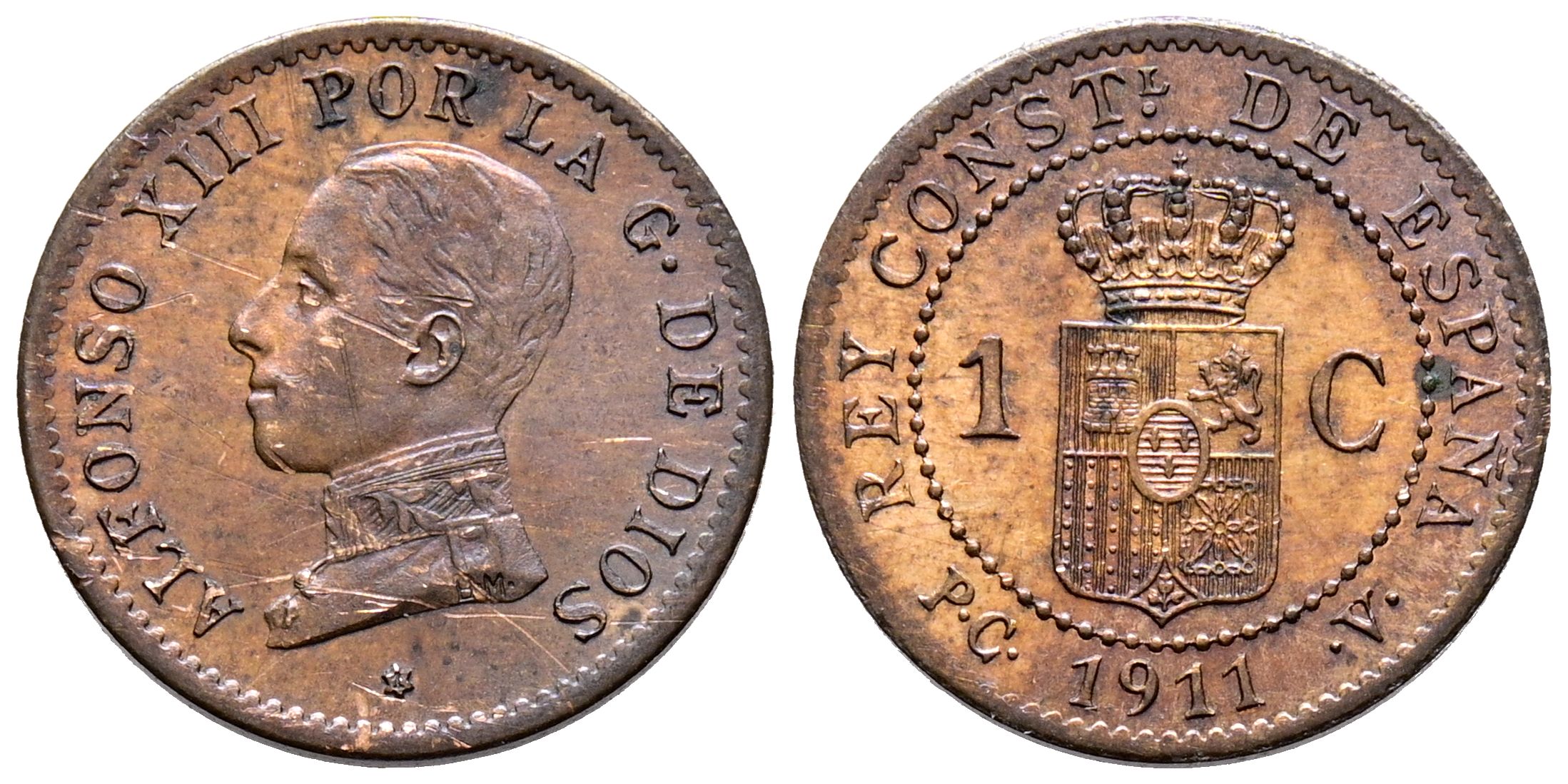 ALFONSO XIII (1885-1931). 1 Céntimo. (Ae. 0,88g/15mm). 1911 *1. Madrid PCV. (Cal-2019-3). EBC/EBC+. Rayas en anverso. Preciosa pátina. Escasa.