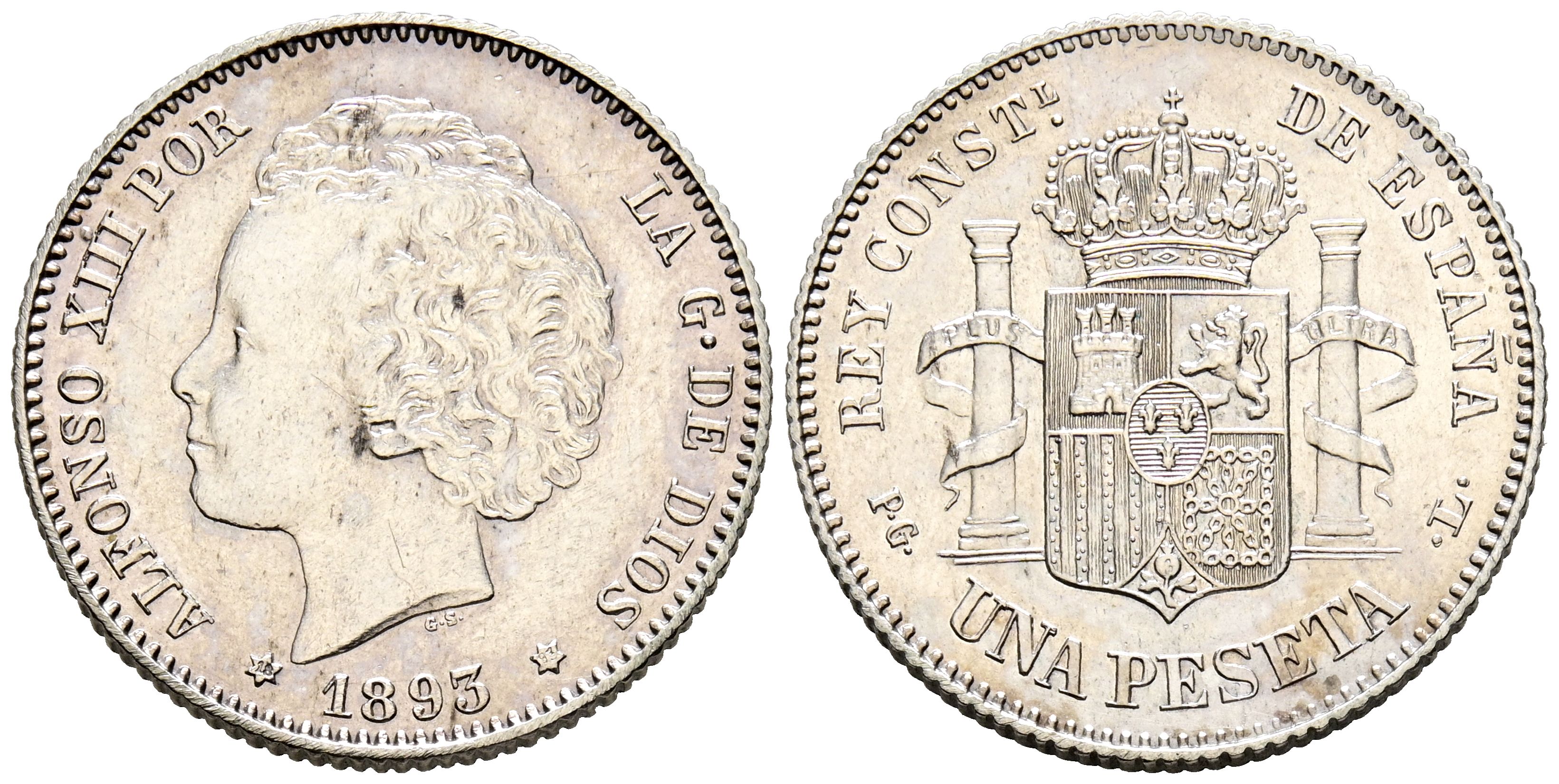 ALFONSO XIII (1885-1931). 1 Peseta. (Ar. 5,04g/23mm). 1893 *18-93. Madrid PGL. (Cal-2019-54). EBC-. Limpiada. Escasa.