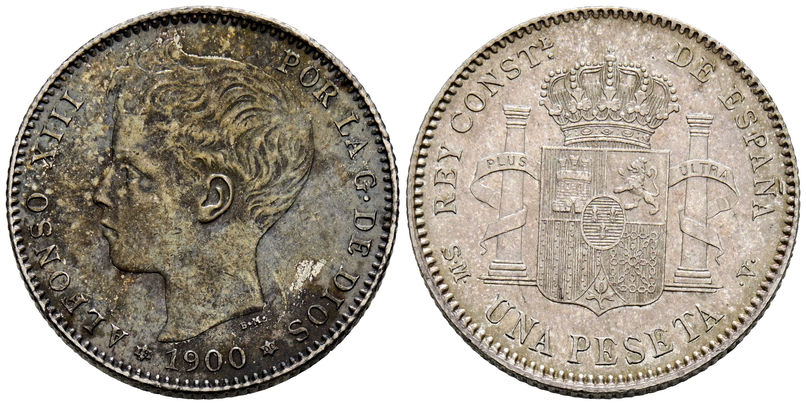 ALFONSO XIII (1885-1931). 1 Peseta. (Ar. 4,94g/23mm). 1900 *19-00. Madrid SMV. (Cal-2019-59). EBC-. Ligeras marqitas. Pátina oscura en anverso.
