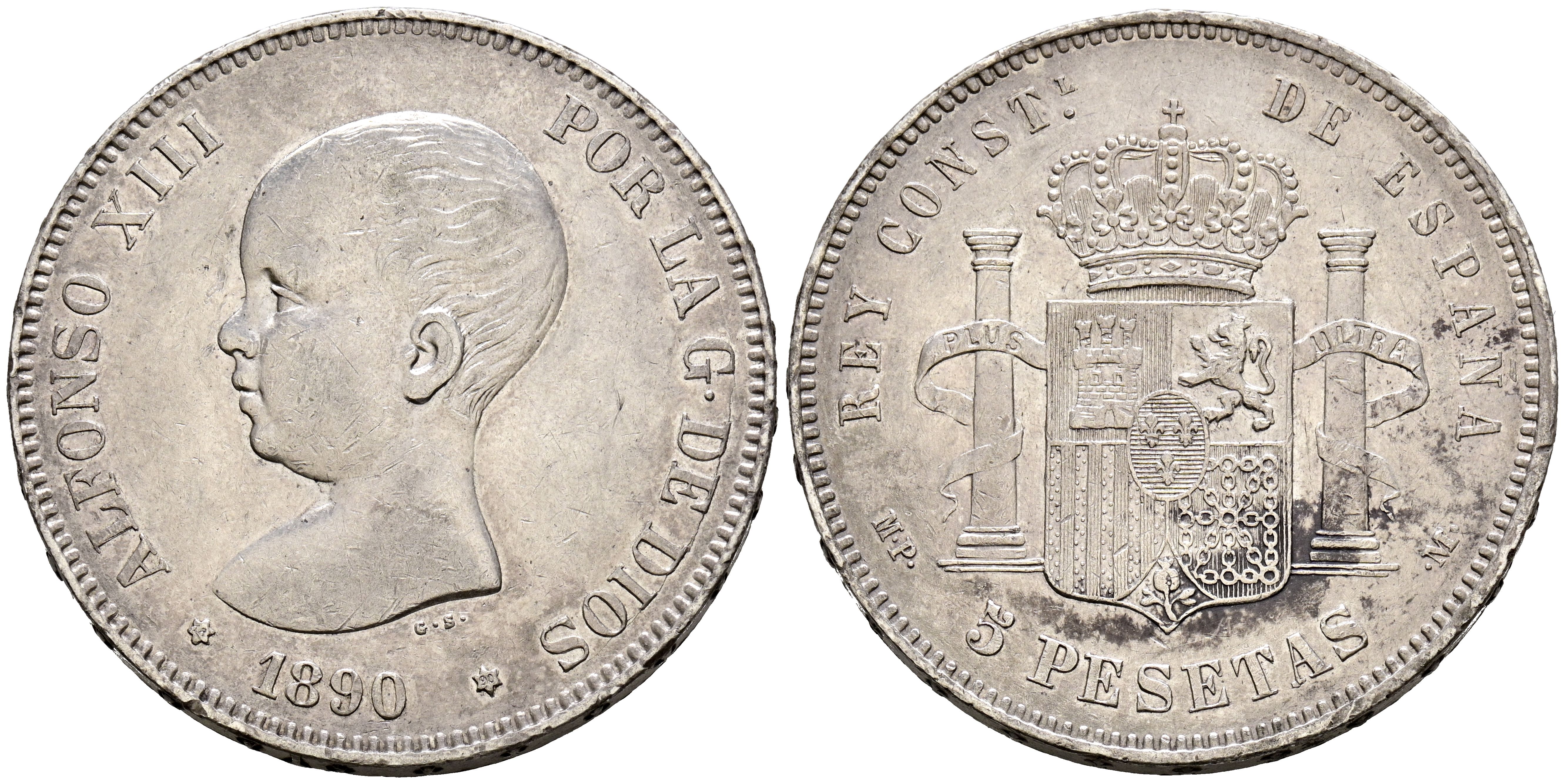 ALFONSO XIII (1885-1931). 5 Pesetas. (Ar. 24,88g/37mm). 1890 *18-90. Madrid MPM. (Cal-2019-95). MBC+. Marquitas. Bonita pátina.