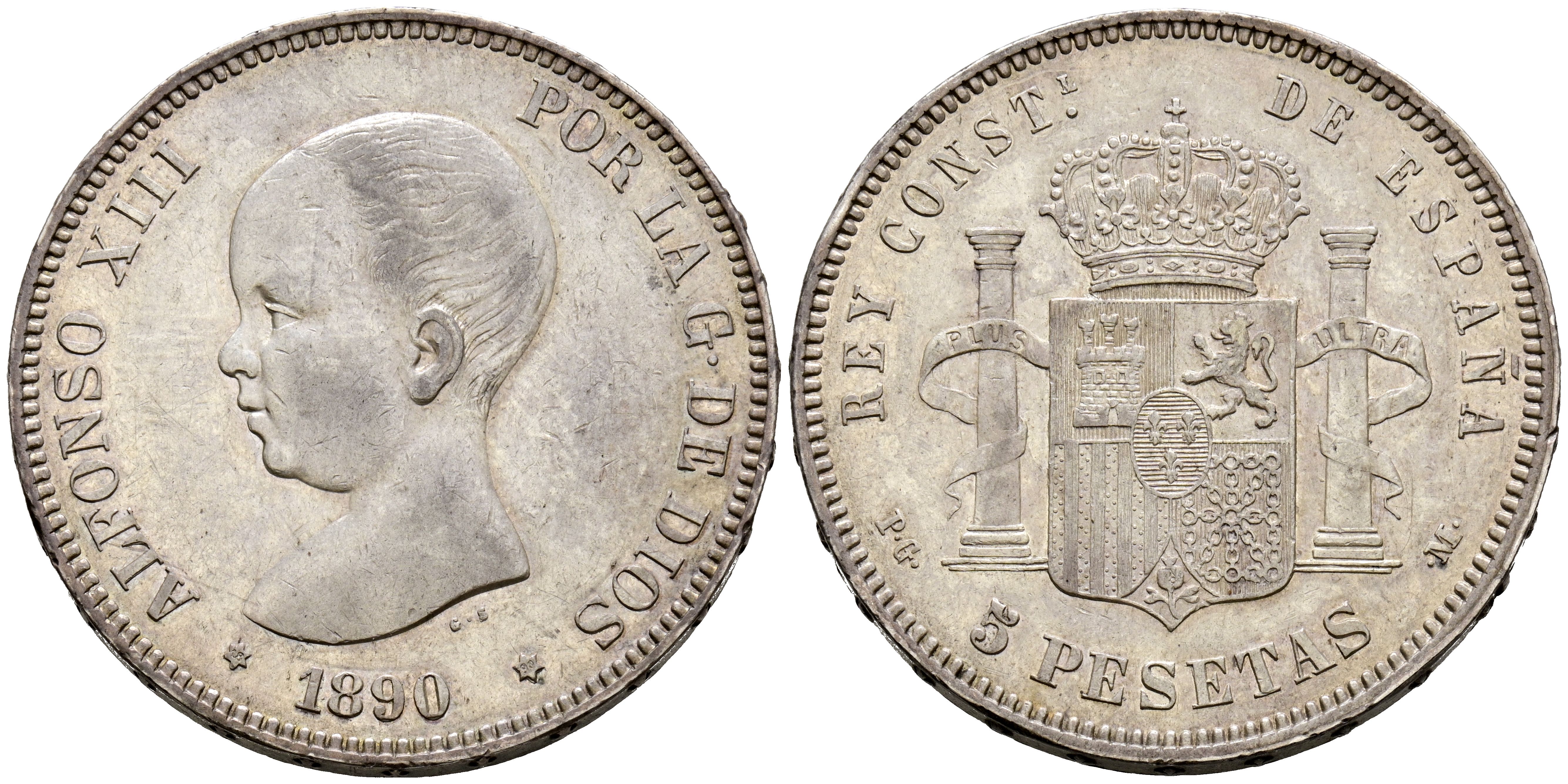 ALFONSO XIII (1885-1931). 5 Pesetas. (Ar. 24,93g/37mm). 1890 *18-90. Madrid PGM. (Cal-2019-97). EBC-. Preciosa pátina. Restos de brillo original.