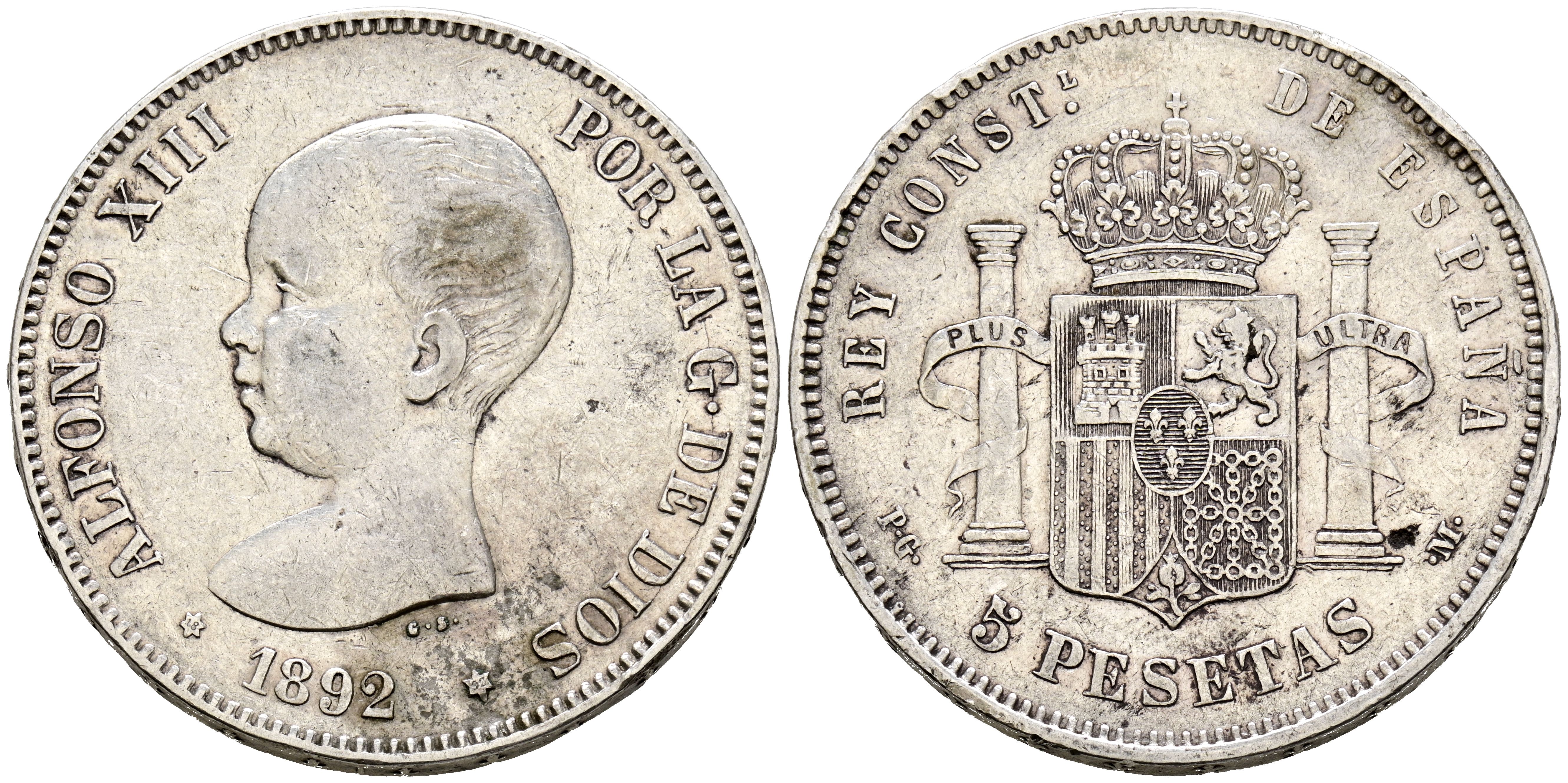 ALFONSO XIII (1885-1931). 5 Pesetas. (Ar. 24,66g/37mm). 1892 *18-92. Madrid PGM. (Cal-2019-99). MBC-.