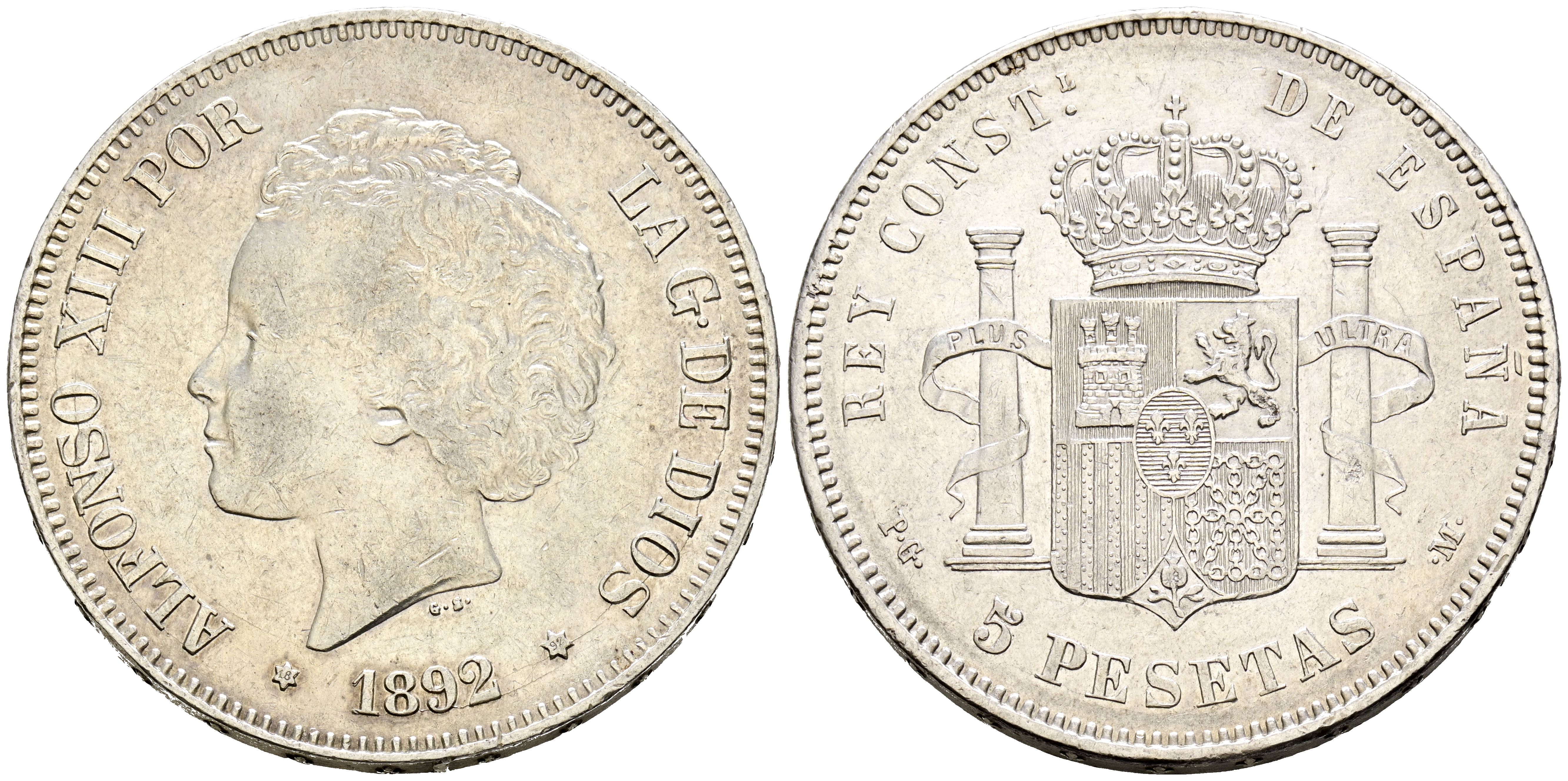 ALFONSO XIII (1885-1931). 5 Pesetas. (Ar. 24,71g/37mm). 1892 *18-92. Madrid PGM. (Cal-2019-100). MBC+.