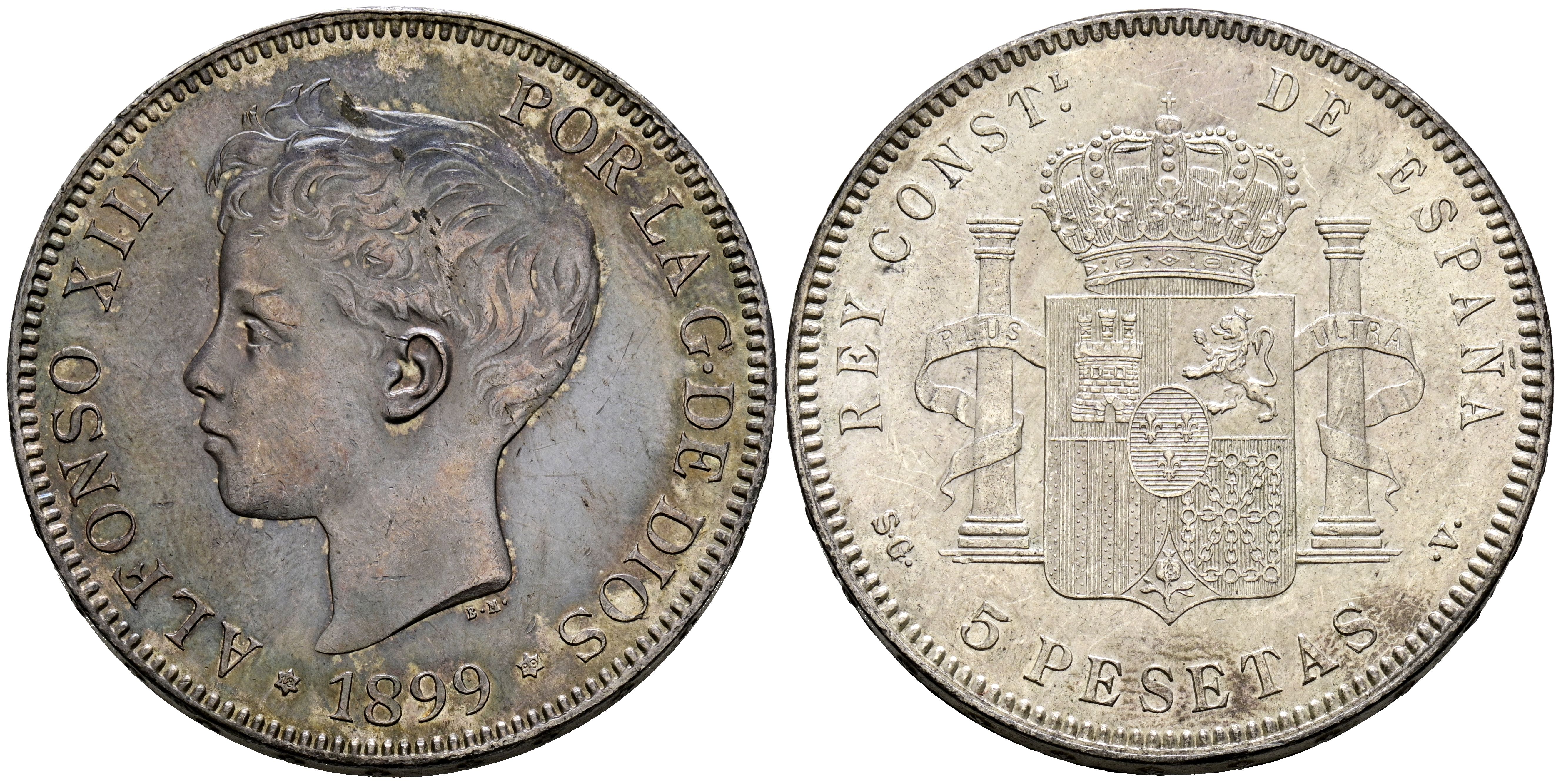 ALFONSO XIII (1885-1931). 5 Pesetas. (Ar. 24,80g/37mm). 1899 *18-99. Madrid SGV. (Cal-2019-110). EBC-/MBC+. Bonita pátina en anverso.