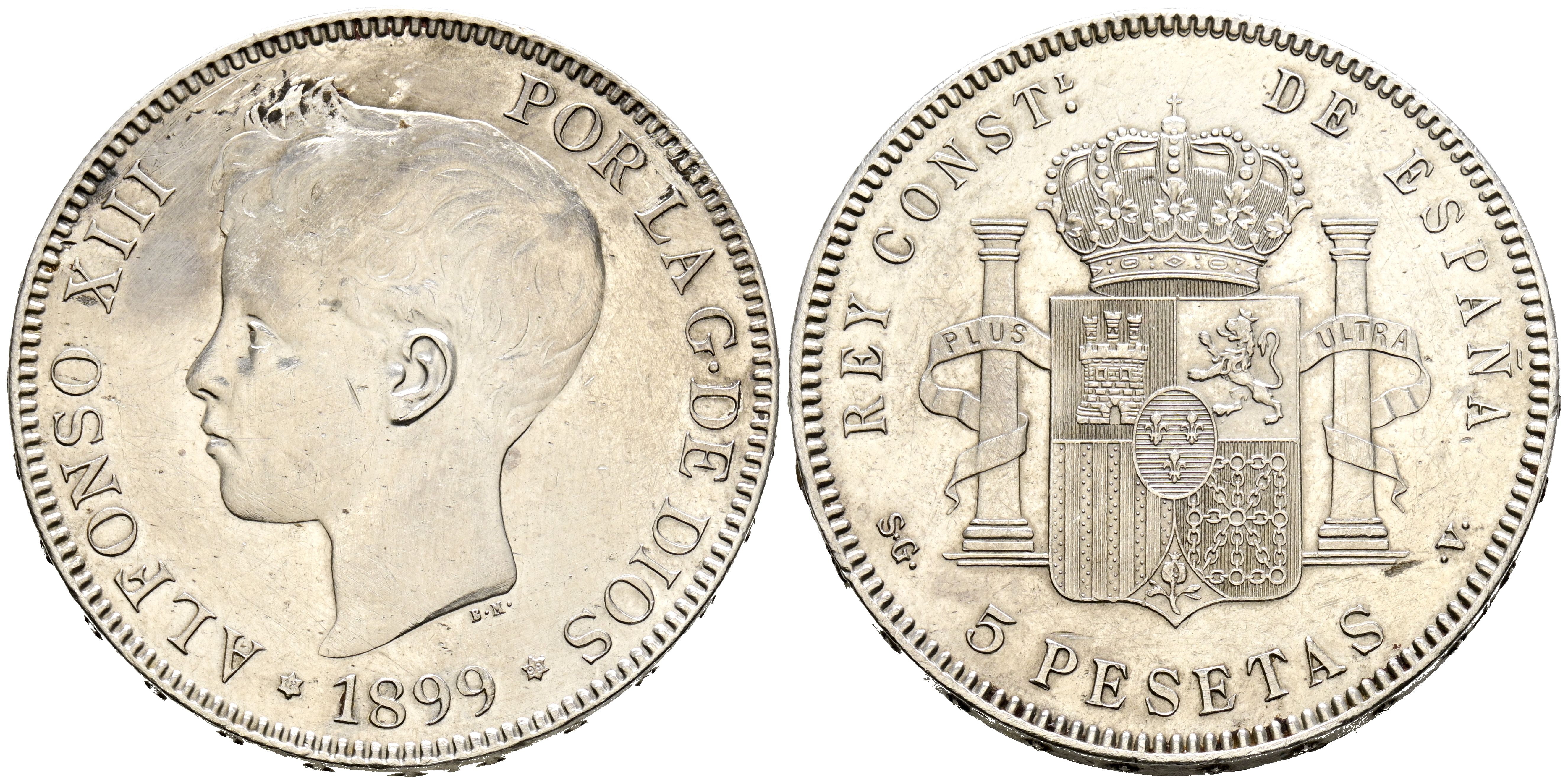 ALFONSO XIII (1885-1931). 5 Pesetas. (Ar. 24,77g/37mm). 1899 *18-99. Madrid SGV. (Cal-2019-110). EBC-/EBC. Rayitas de limpieza.