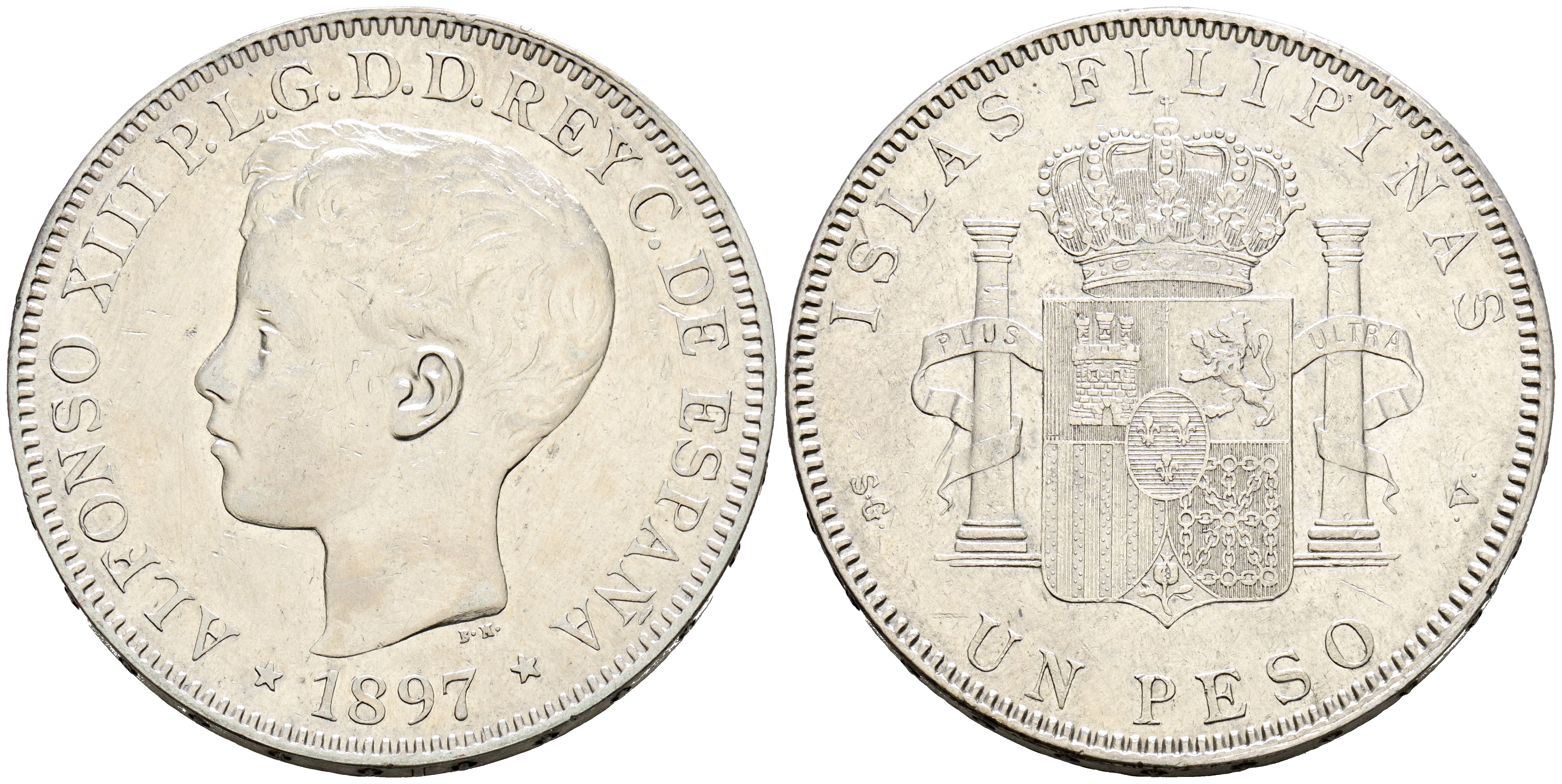 ALFONSO XIII (1885-1931). 1 Peso. (Ar. 24,93g/37mm). 1897. Manila SGV. (Cal-2019-122). MBC+. Marquitas.