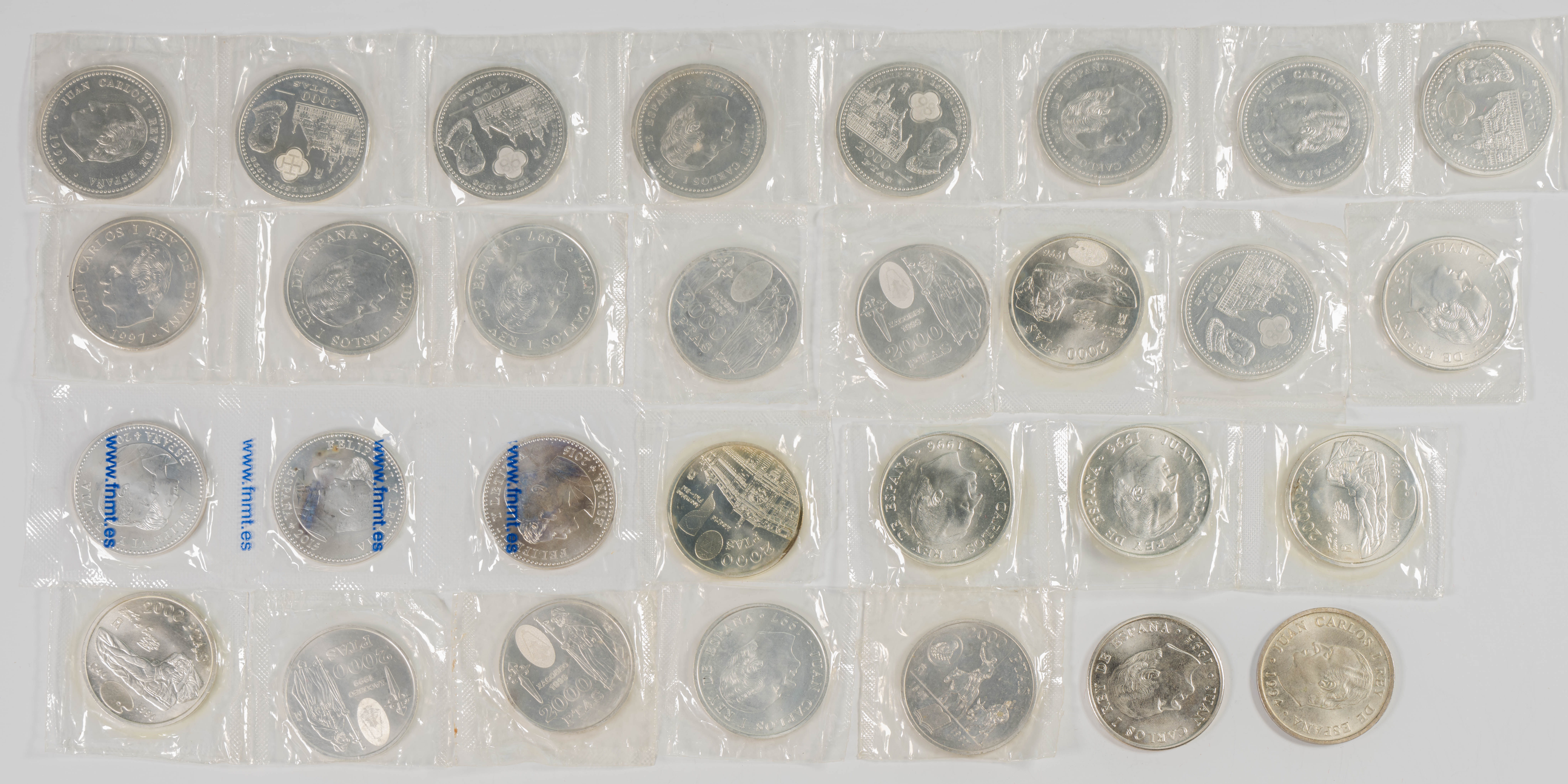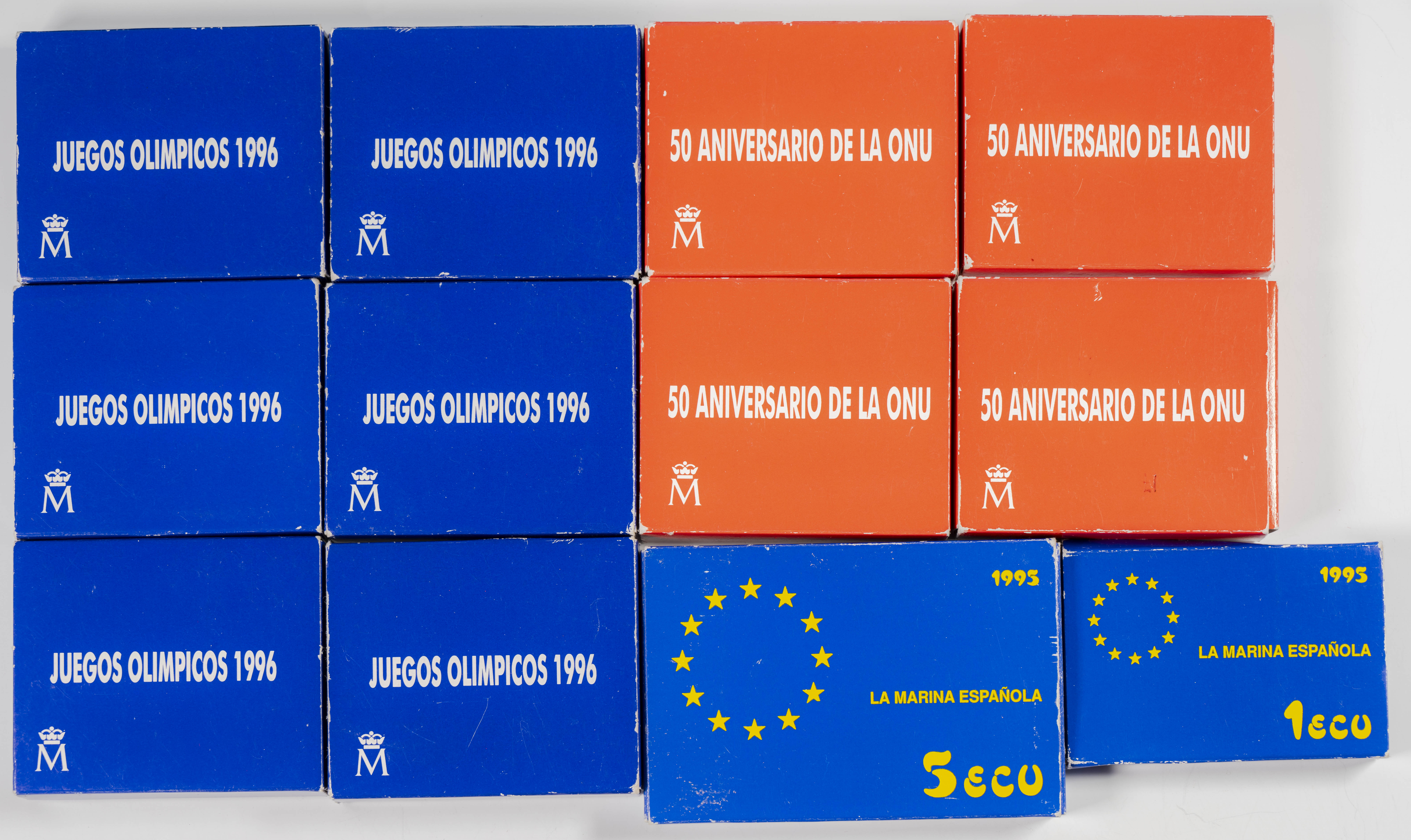 ESPAÑA. Excepcional conjunto formado por un gran número de monedas, presentadas en álbumes y estuches, acuñadas durante los periodos del Estado Español, Centenario de la Peseta y Época Contemporánea. En el conjunto encontramos una gran cantidad de piezas en plata, principalmente conmemorativa, destacando las 3 emisiones de la Serie Iberoamericana, decenas de pieza de 2000 Pesetas, Duros y módulos pequeños del Centenario. Diferentes estados de conservación. A EXAMINAR.