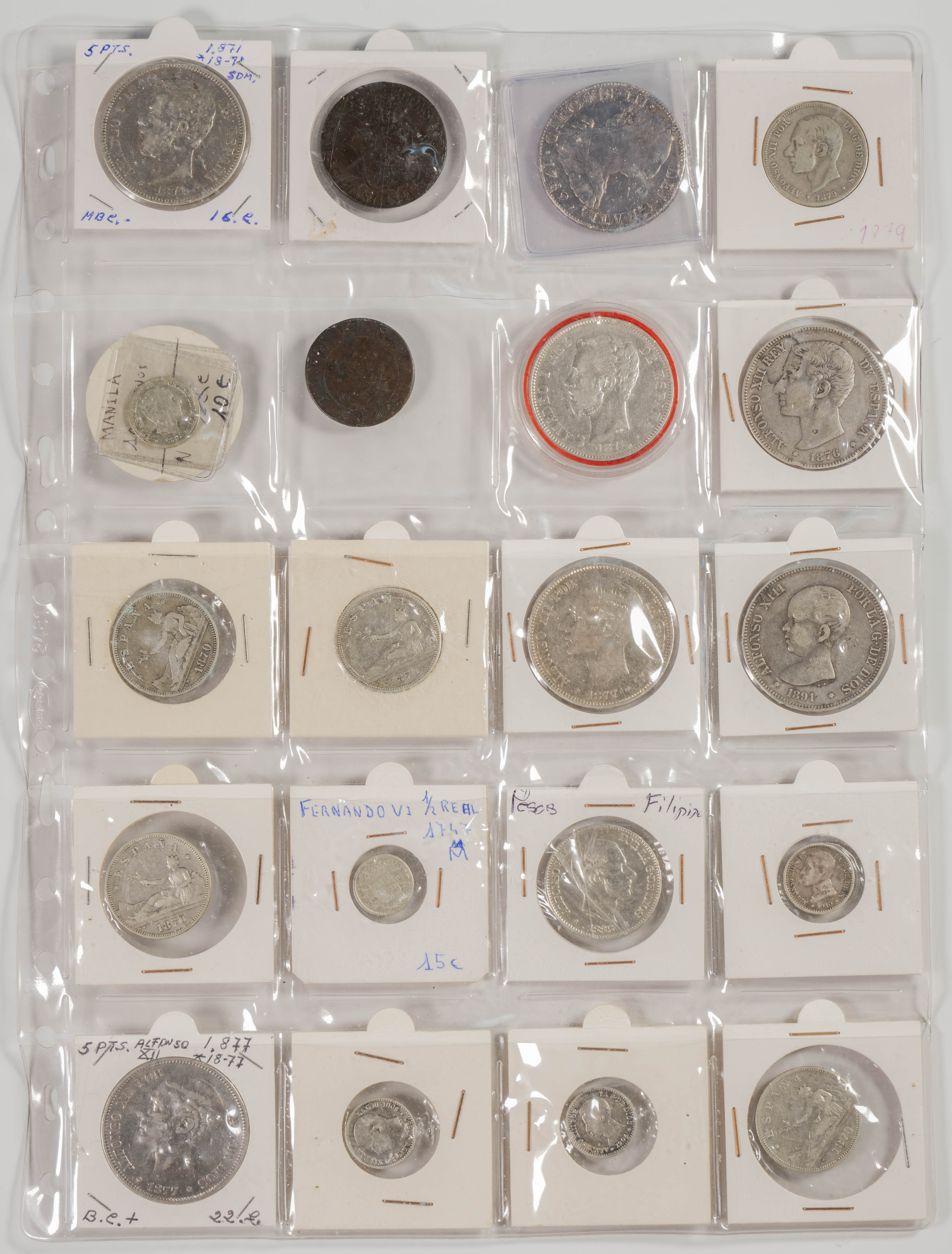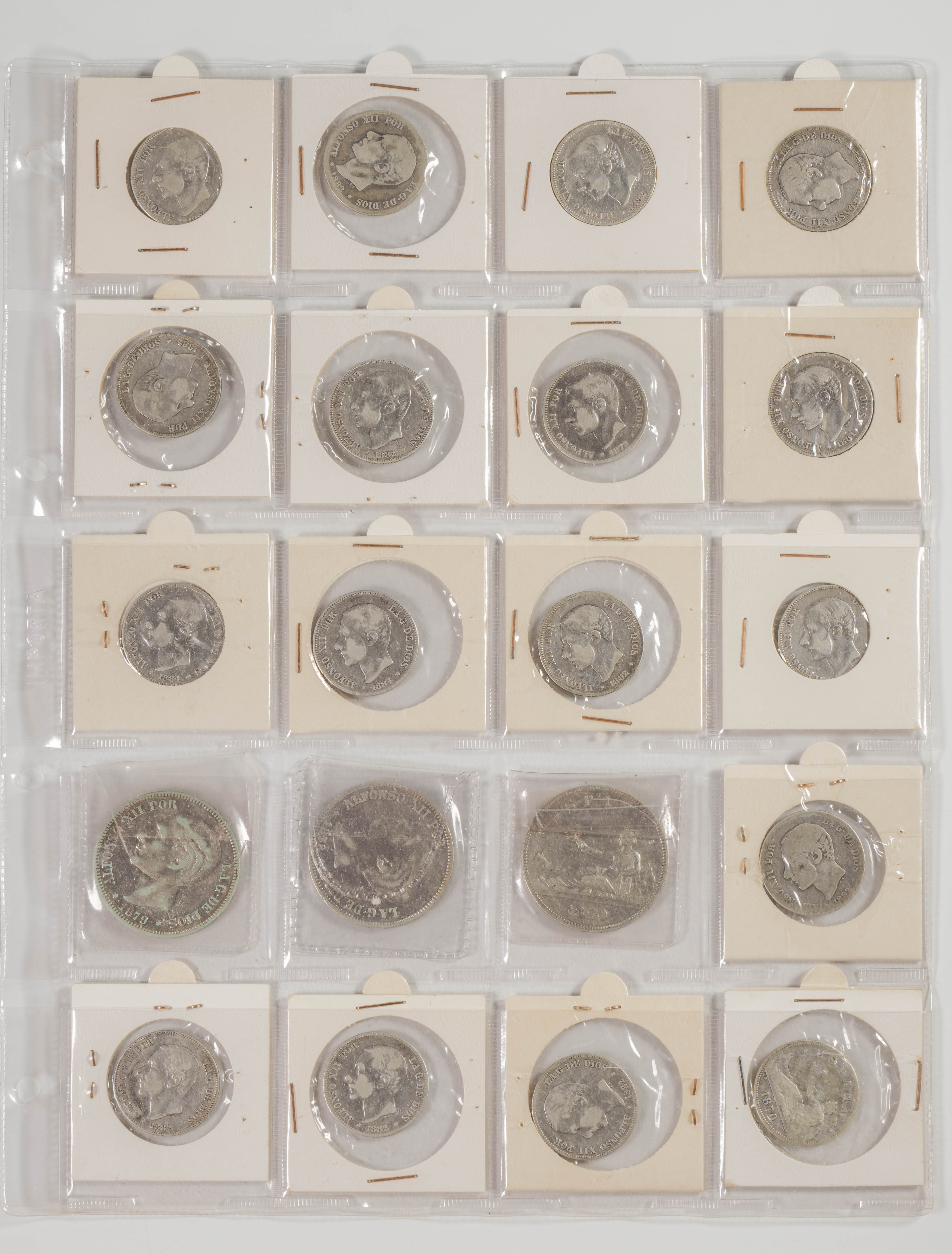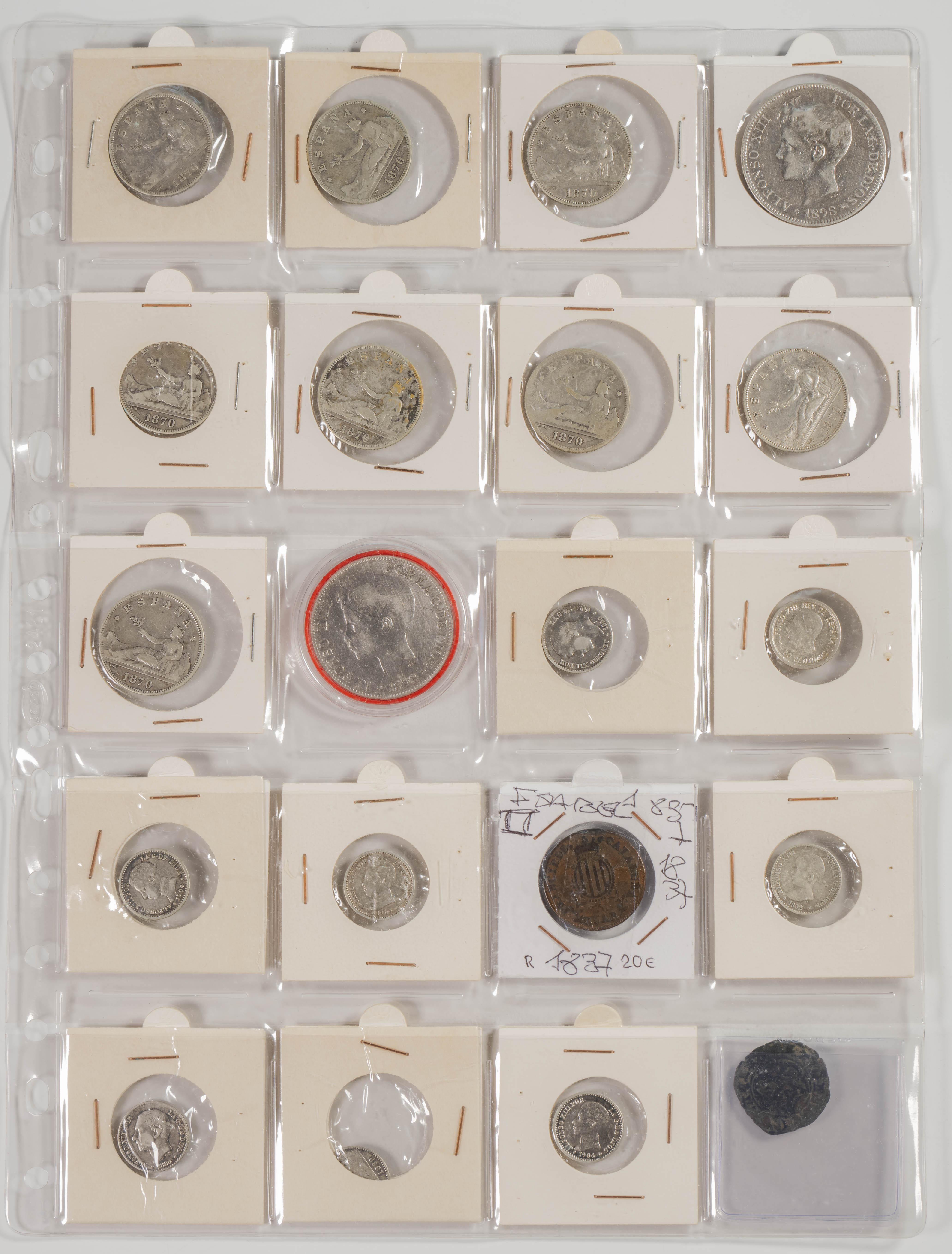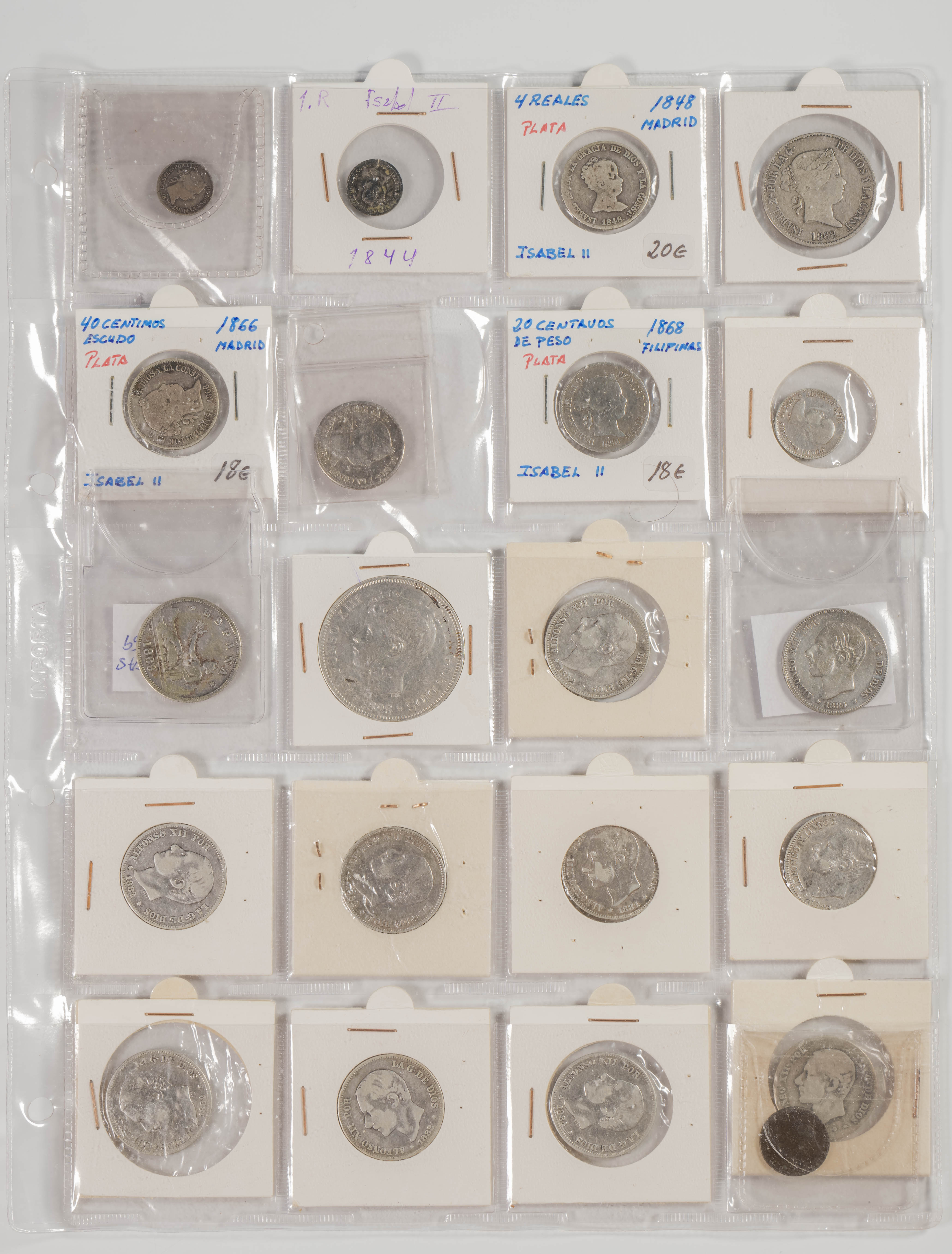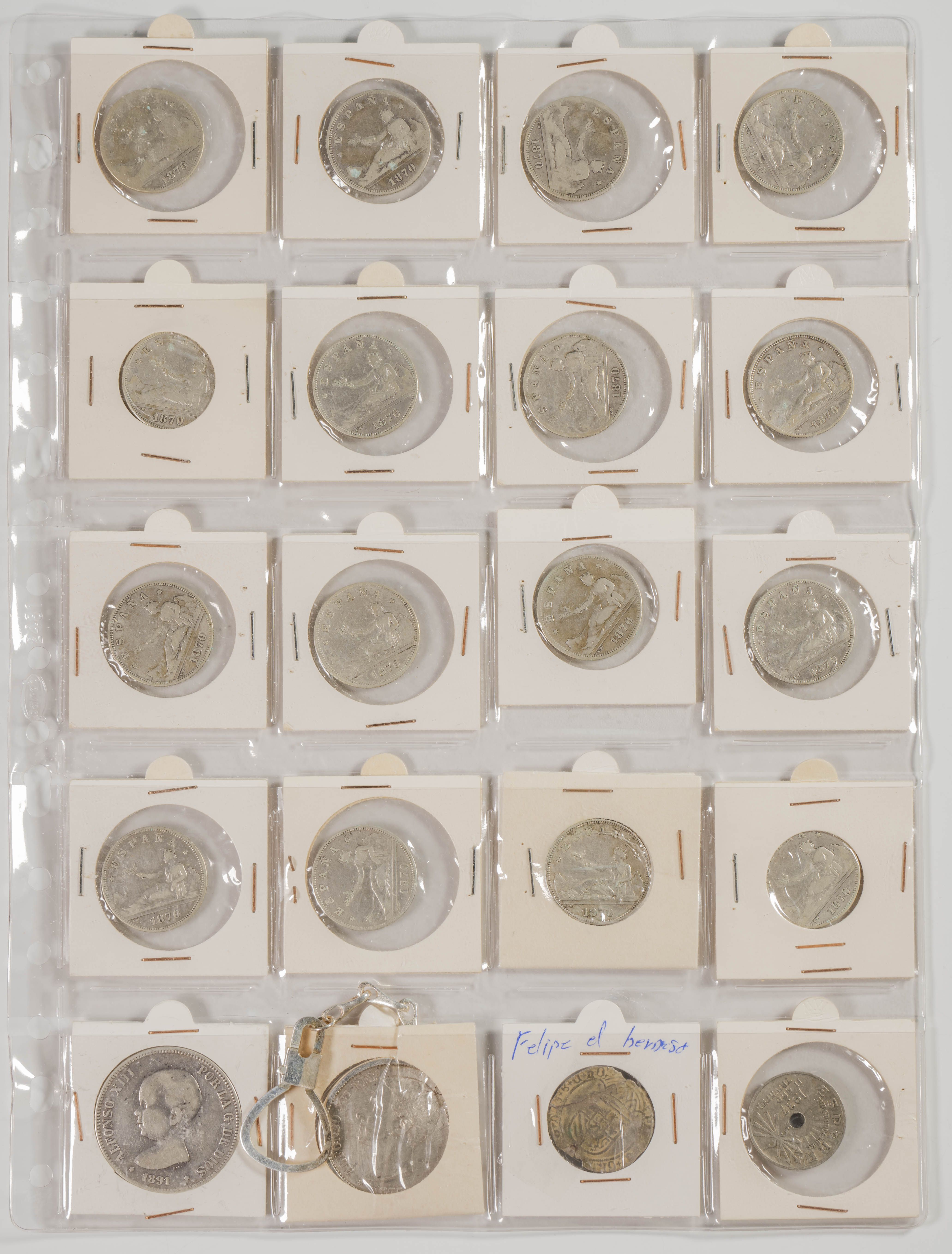 Excepcional conjunto de centenares de piezas con una enorma cantidad de ejemplares en plata y tipo duro. En el conjunto destacan, por número, una amplia colección de monedas del Centenario y más de 200 piezas de 100 Pesetas de 1966 del Estado Español. El conjunto se completa con ejemplares de Monarquía Española, un buen y variado surtido de plata extranjera en el que hay dólares, kookaburras, pandas e incluso algunos pequeños lingotes. Finalmente, se incluyen 3 marcos con medallas y sellos en plata. Diferentes estados de conservación. IMPRESCINDIBLE EXAMINAR.