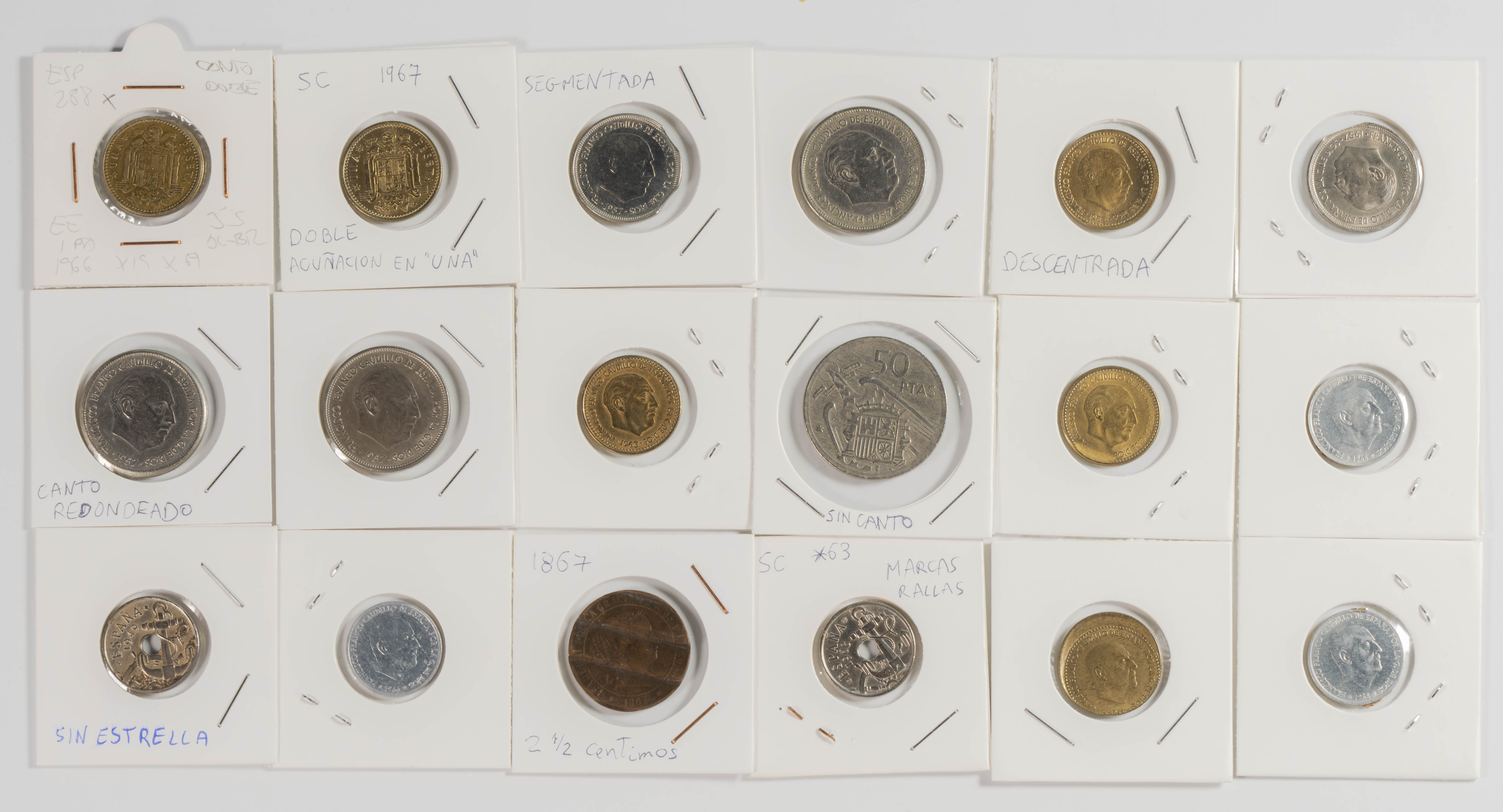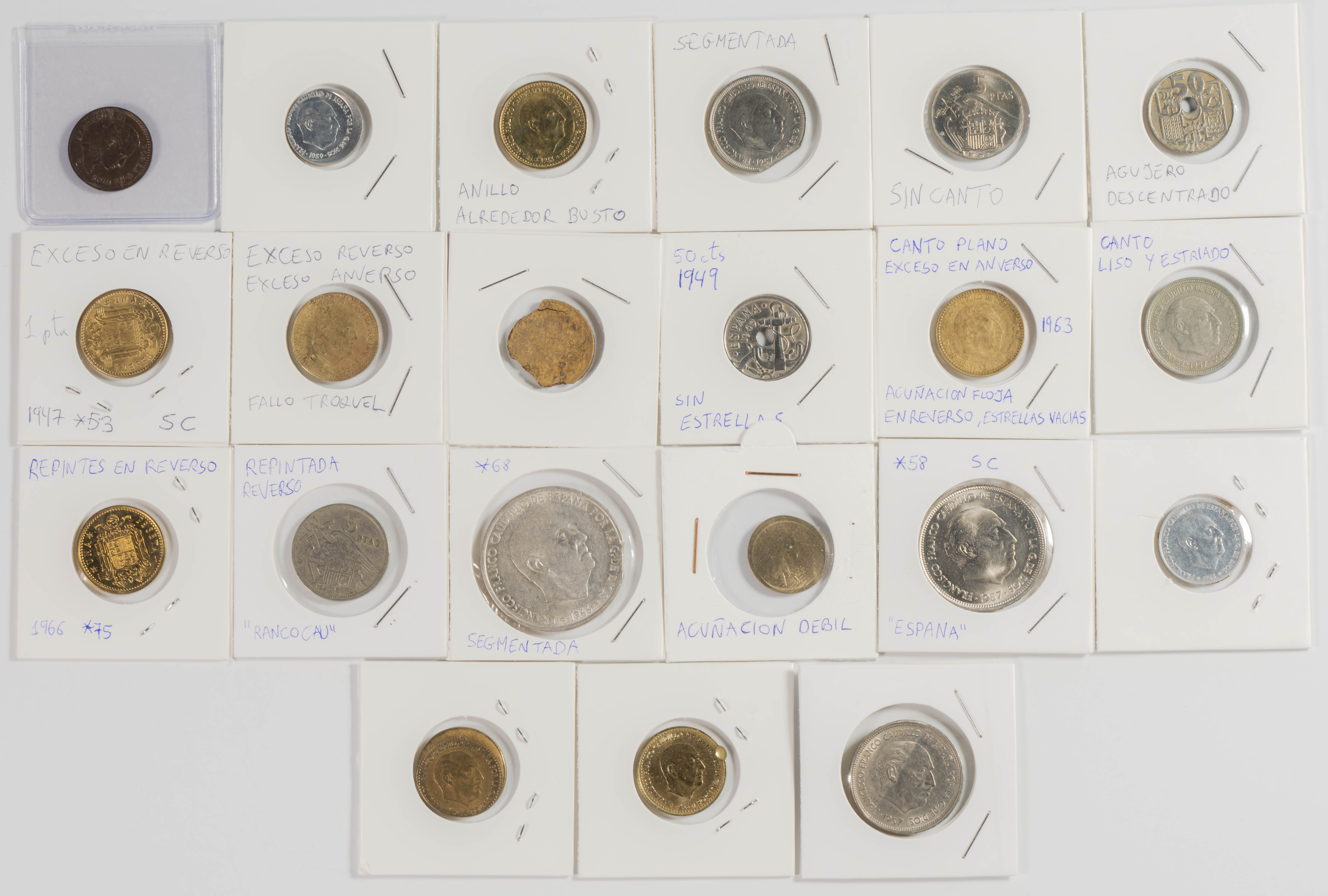 Interesante y amplio conjunto formado por 39 piezas, en su inmensa mayoría del Estado Español, con errores y variantes de acuñación: desplazamientos, diferentes grosores de cospel, segmentaciones, etc. Diferentes estados de conservación. IMPRESCINDIBLE EXAMINAR.