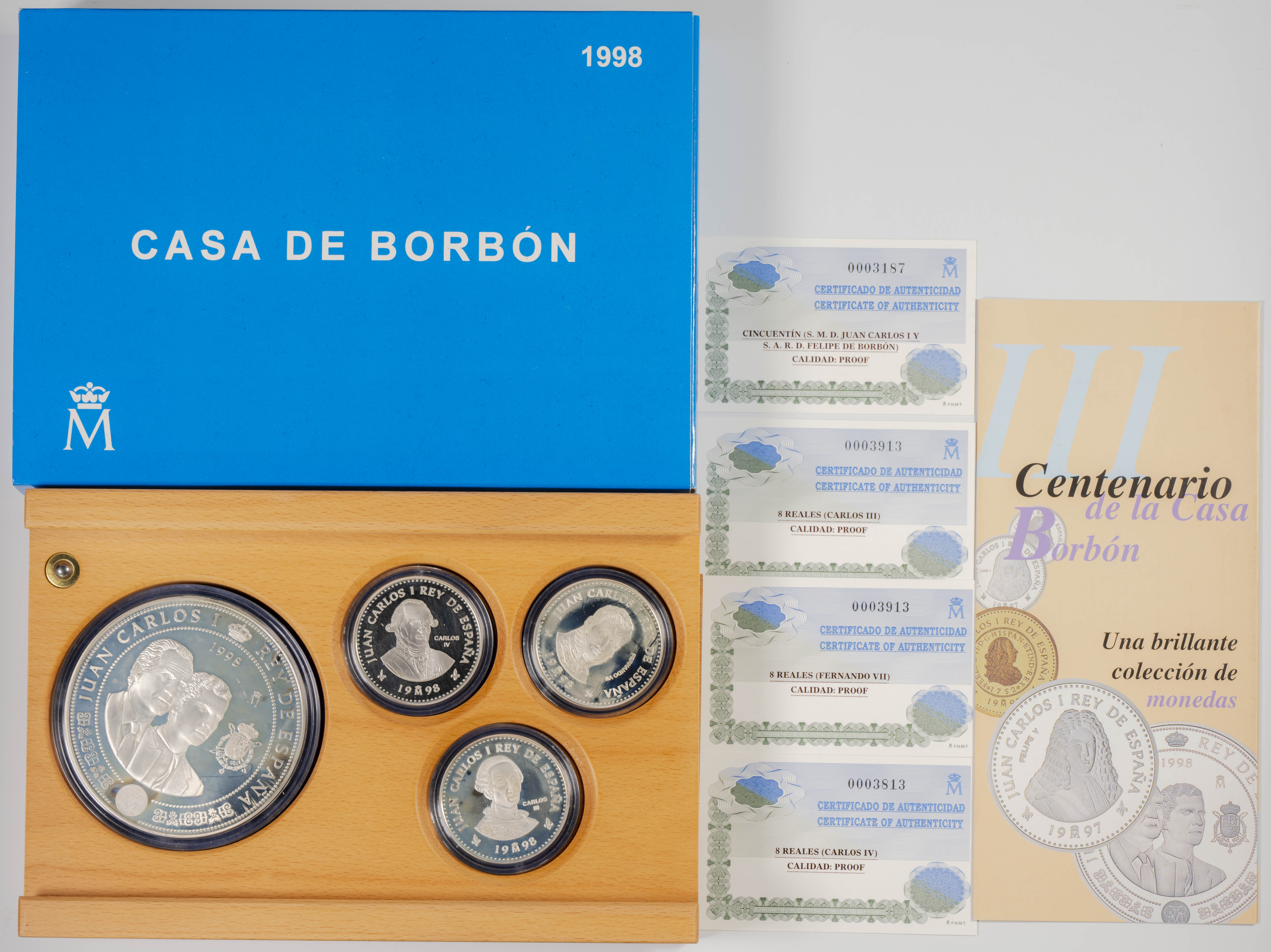 JUAN CARLOS I (1975-2014). III Centenario Casa de Borbón. 1998. FNMT. 4 Monedas con valores de 10.000 (1) y 2.000 Pesetas (3). PROOF. Incluye estuche original, cápsulas y certificados de autenticidad