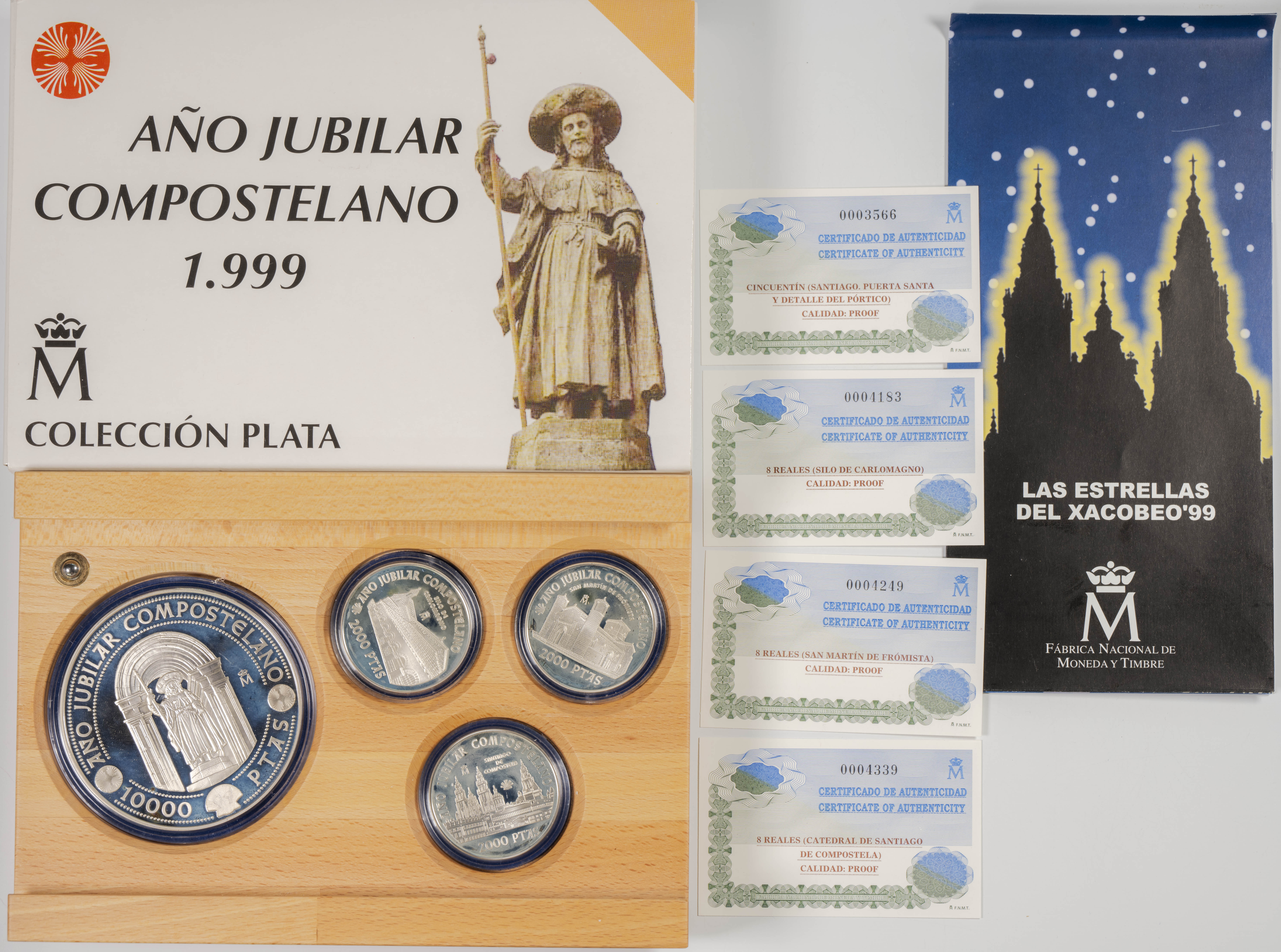 JUAN CARLOS I (1975-2014). Año Jubilar Compostelano. 1999. FNMT. 4 Monedas con valores de 10.000 (1) y 2.000 Pesetas (3). PROOF. Incluye estuche original, cápsulas y certificados de autenticidad
